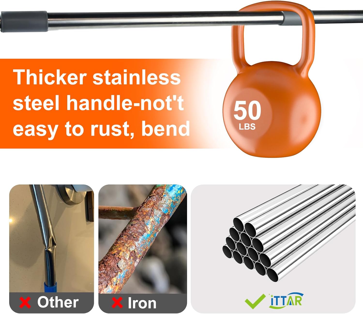 - Ergonomic Design: ITTAR squeegee for floor features an ergonomic stucture, which can support of pushing for large areas or pulling in a limited space. Garage squeegee with stainless steel pole is strudy enough not easy to bend. 62" long handle squeegee can save your back and kness, keep you out of pain