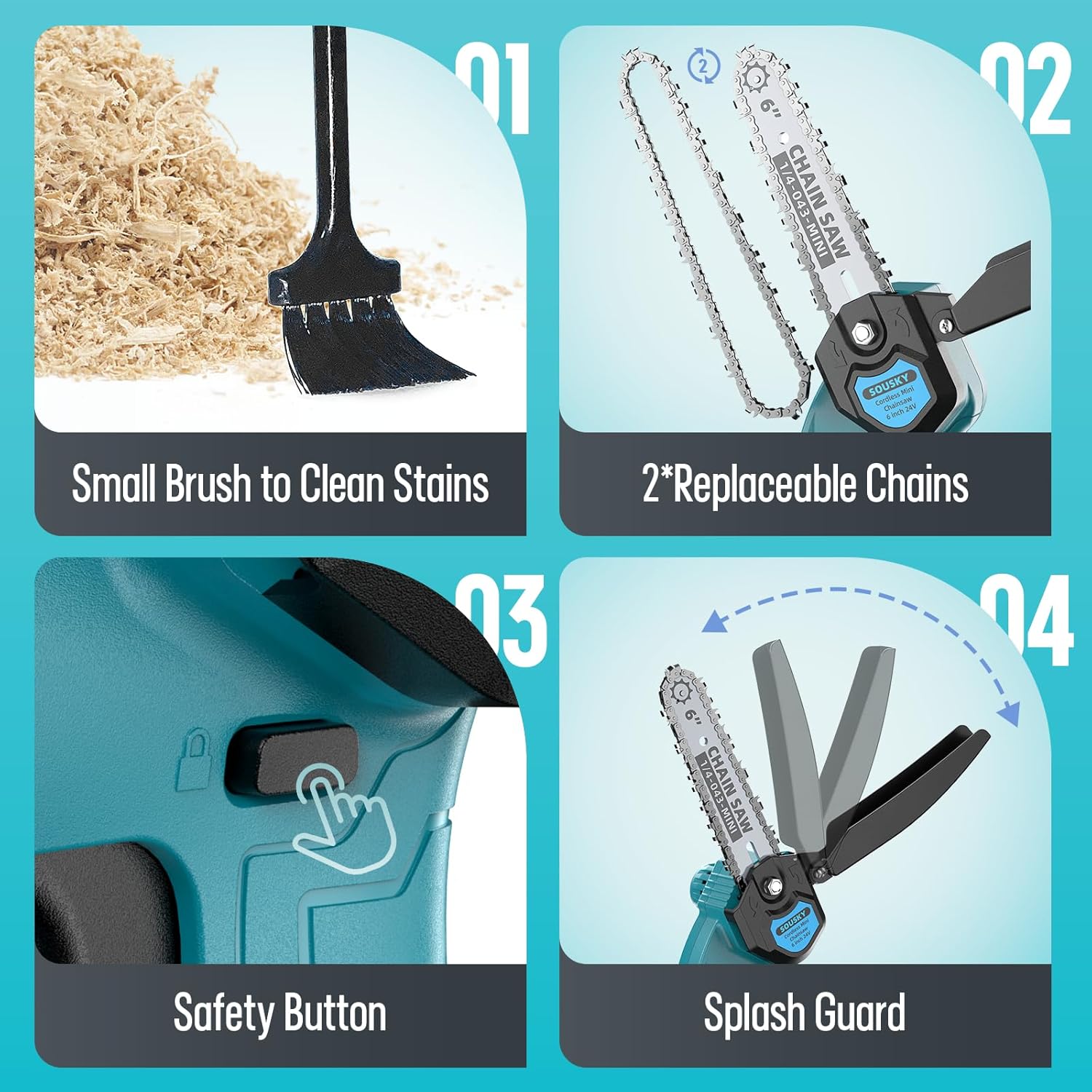 - 【Full Accessories & Great After-Sales Service】:Mini Chainsaw ×1, Rechargeable Li-on Battery ×2, Chain ×2 (1 has been installed on the chainsaw), Safety Guide Plate ×1, Safety Gloves ×2, Charger ×1, Screwdriver ×1, L-type Socket Wrench×1, Brush×1, Oil Bottle×1, Toolbox ×1, User Manual×1; SOUSKY will solve your problems online 24 hours a day. Feel free to answer your questions anytime
