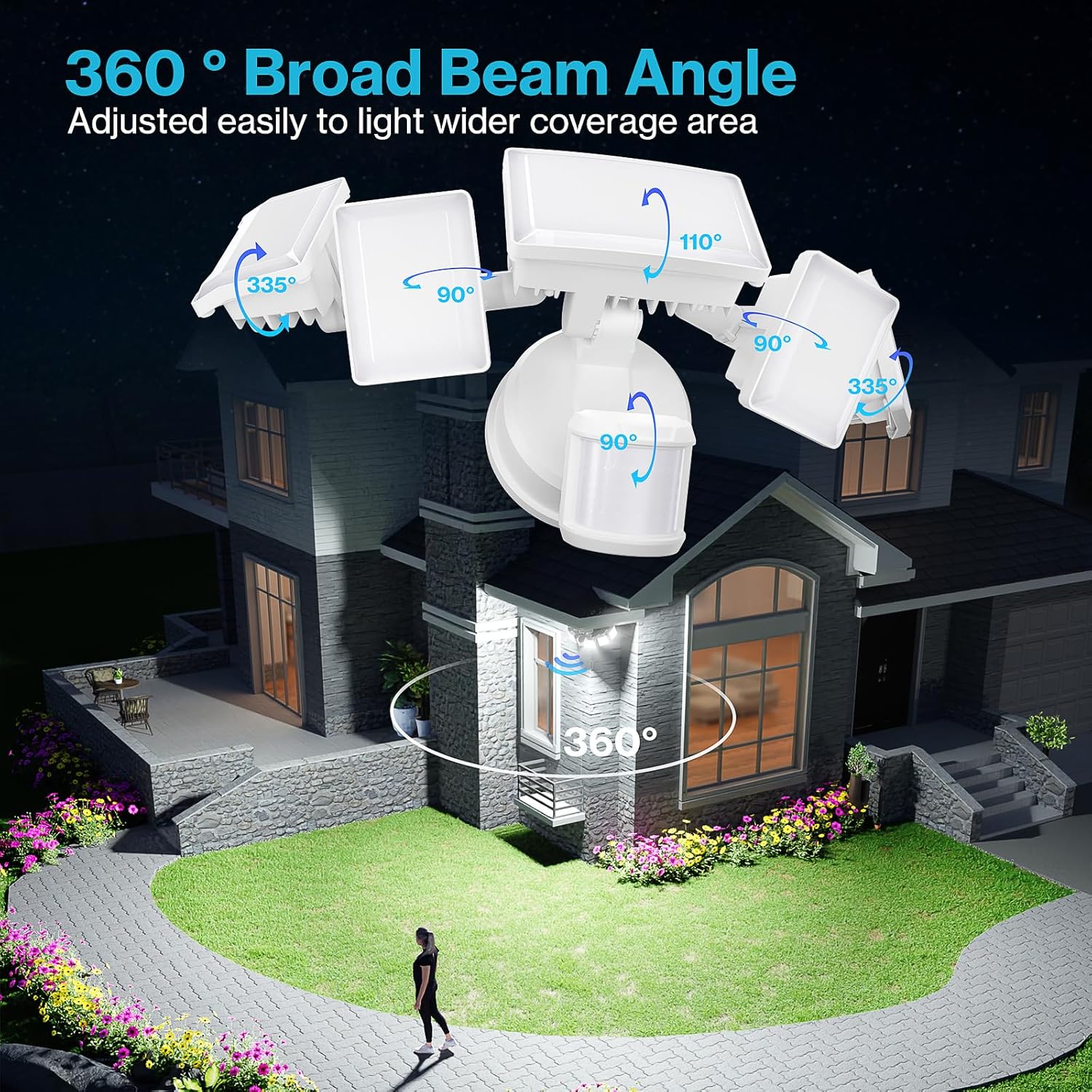 - Light Up Wide Coverage: This 10,000 lm motion lights for outside lights up yards, garages, driveways, and more. Its five-headed adjustable design provides 360-degree coverage, illuminating up to 1977 square feet to enhance home security at night