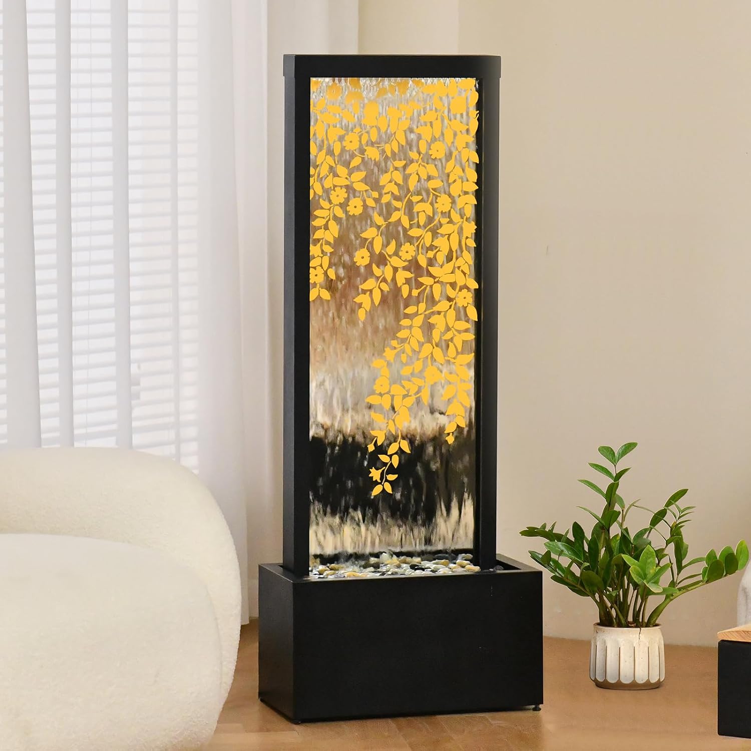 46" H Fountains Outdoor Indoor Tall Waterfall Fountain with LED Lights Large Modern Mirror Fountain for Garden,Patio,Backyard,Home,Black Silver Golden