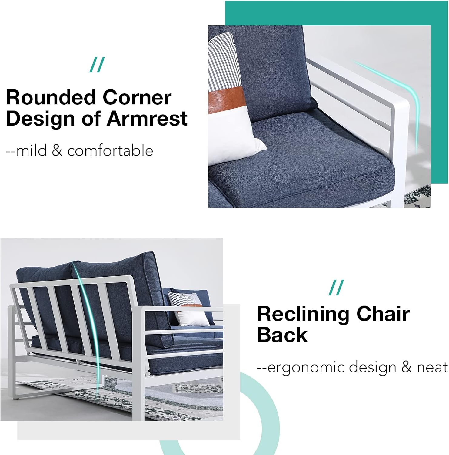 - [Designed for Comfort and Style]: Abandoning the conventional styles, the exterior design of the aluminum outdoor couch is created by the leading group. Engineered with ample and reclining back support for maximum comfort. The unique open and round-corner design for armrests with 2 round tubes on the sofas gives the outdoor 3-seater sofa an airy and mild silhouette. Rounded corner legs are adjustable to level on any type of surface.