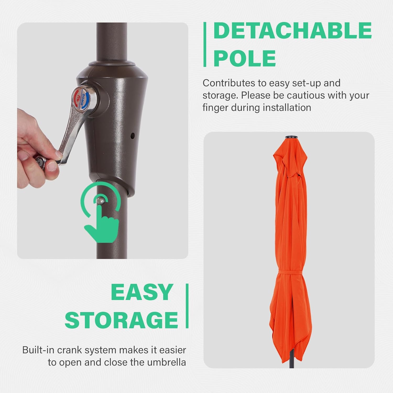 - QUICK SET-UP: Ξ¦1.5 Inches Detachable pole contributes to easy setup and storage. Please be cautious with your finger during installation.(Note: Umbrella base not included)