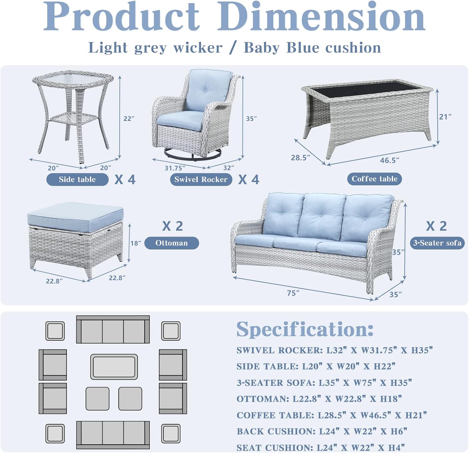 - Size : 13 PCS - 4 Swivel Rocker & 2 Sofa & 5 Table