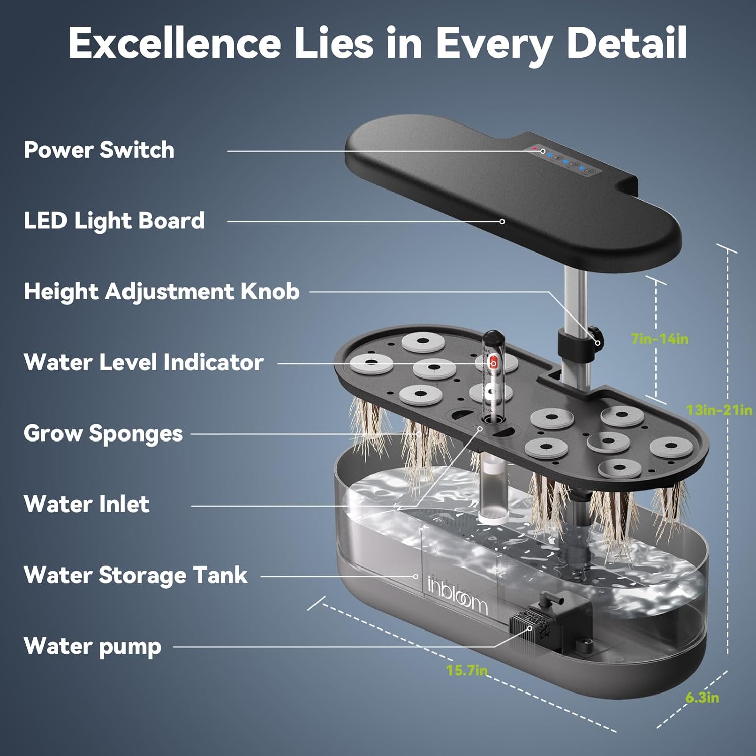 inbloom 12 Pods Hydroponics Growing System Kit, Herb Garden Planter Indoor Kit, Indoor Gardening Hydroponics Growing System with 4.2L Water Pump, Height Adjustable, Gifts for Woman, Transparent Black