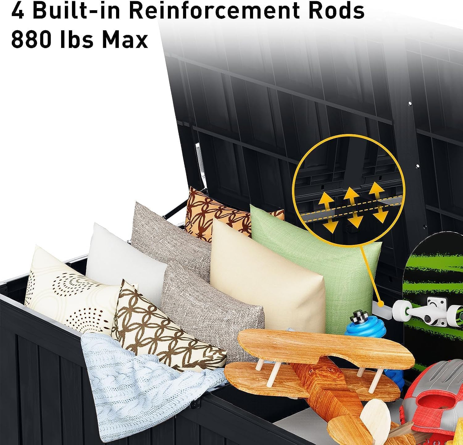 - ROBUST AND RELIABLE DESIGN - Engineered for heavy-duty use, this deck box can support up to 900 lbs, thanks to its reinforced metal rods and internal supports. Its thicker (0.08'') panels and precise assembly ensure superior stability and prevent warping or deformation over time.