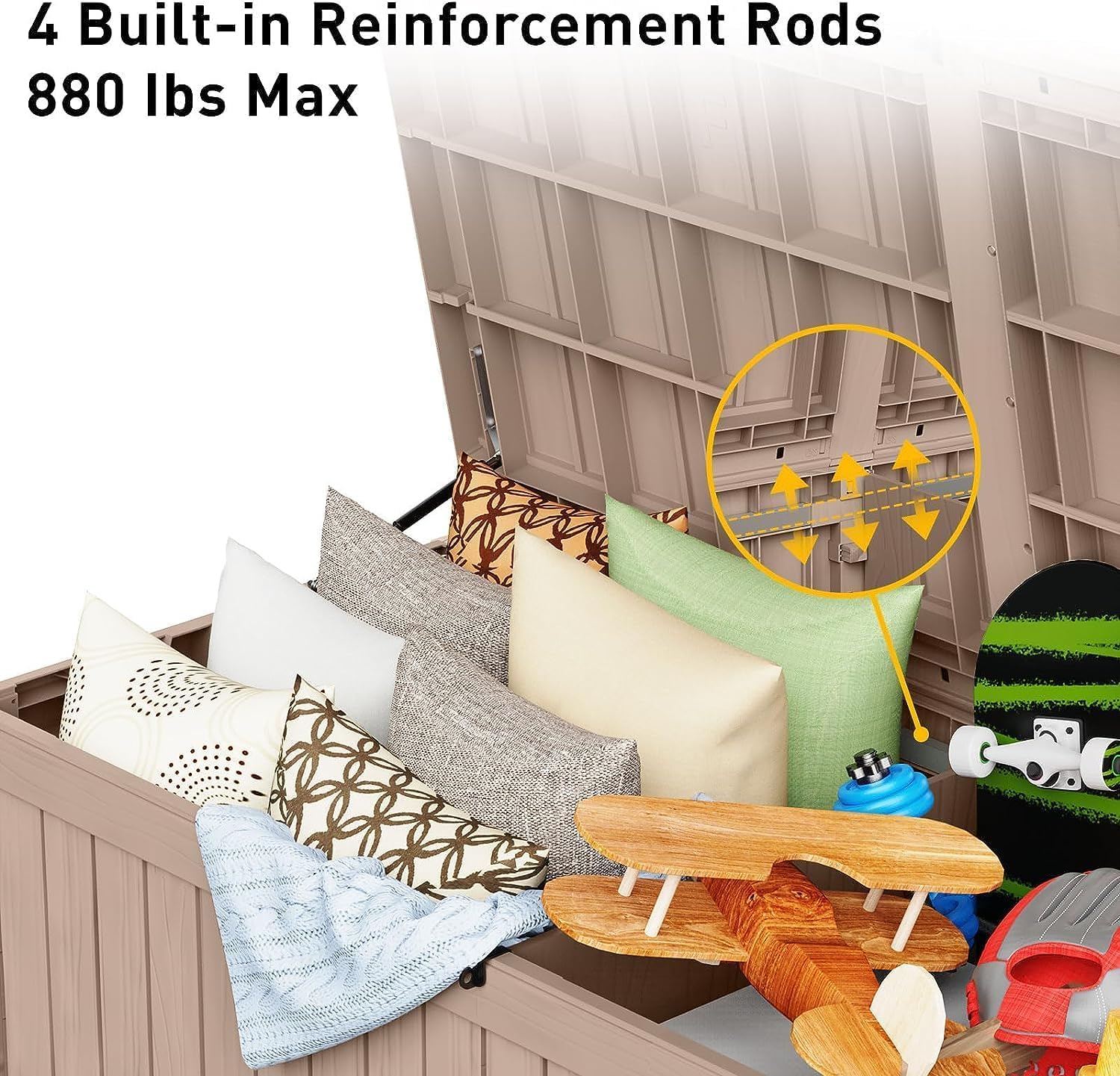 - ROBUST AND RELIABLE DESIGN - Engineered for heavy-duty use, this deck box can support up to 900 lbs, thanks to its reinforced metal rods and internal supports. Its thicker (0.08'') panels and precise assembly ensure superior stability and prevent warping or deformation over time.