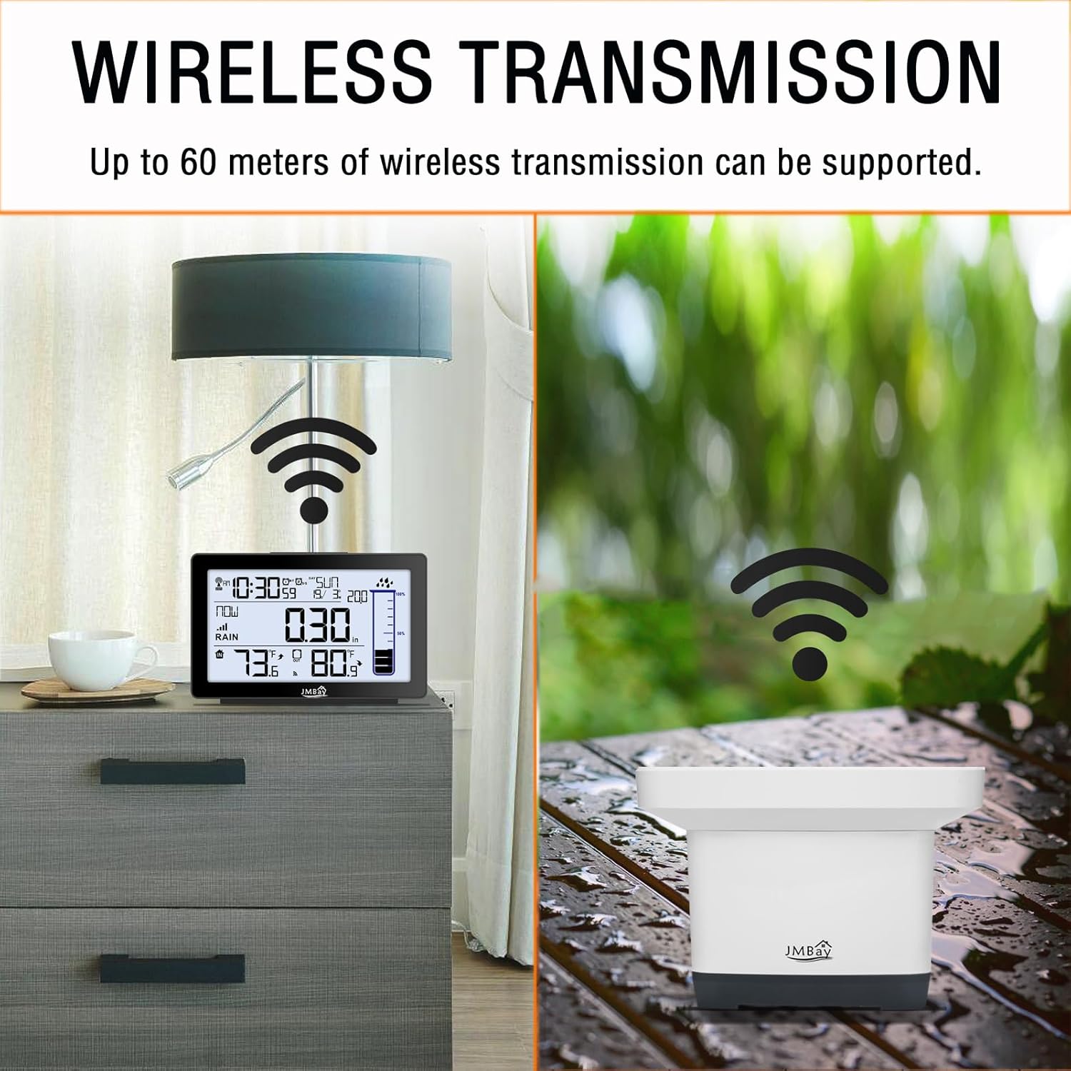 - Multi Function Rain Gauge weather station---In addition to rainfall monitoring, this digital rain gauge can also provide real-time indoor and outdoor temperatures, WWVB Radio control time function. Whatโs more, dual alarm clock with snooze function and calendar is practical in your usual life. Functional and stylish, JMBay rain gauge weather station is the perfect decoration for your living room, bedroom, office, greenhouse, tent, and more.