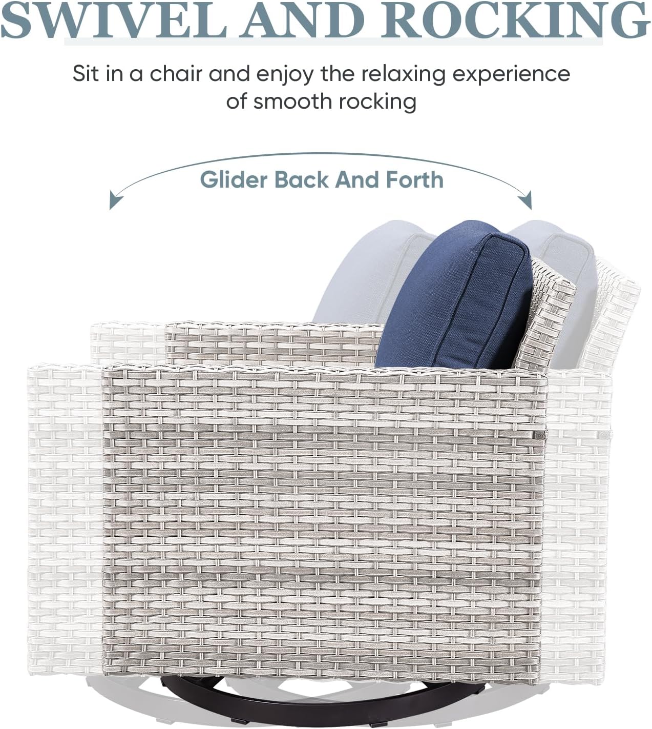 - ă360°Swivel Glider Rocker ChairsăDesign of rotating 360 degree,swinging back and forth,You can easily turn your face away from the sun without moving the entire chair, or swing your seat like a cradle for the ultimate relaxation while listening to music or watching your children play outside.