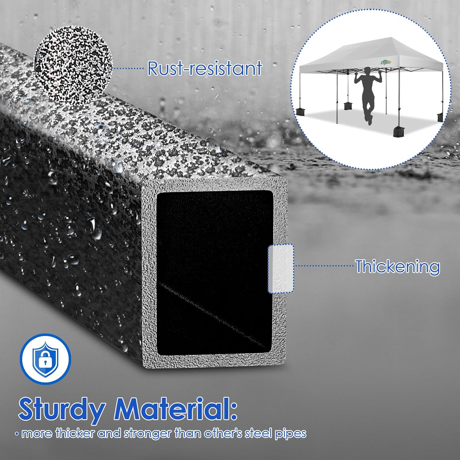 - ✦High Quality Frame Upgrade: High quality powder coated aluminum frame brings incredible strength to this heavy duty pop up canopy,at the same time rust and corrosion resistant. The newly upgraded 32mm steel tube diameter & 0.7mm wall thickness have significantly improved strength compared to other tents on the market and help to provide strong support, can carry up to the weight of 8 people at the same time. With sandbags and wind ropes,it can be stable in winds of 50 km/h.