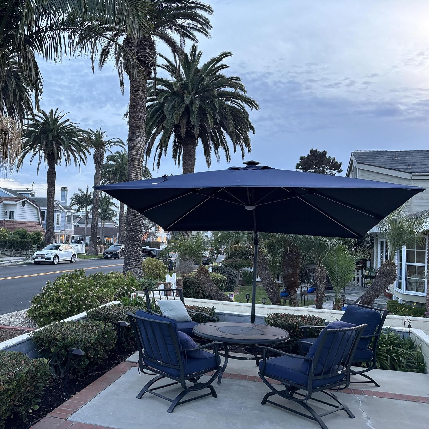- Solar LED Strip Lights: This cantilever umbrella comes with 7 long led lights that is powered by a solar panel on top. (Charge: 9hrs/Run Time: 4hrs)