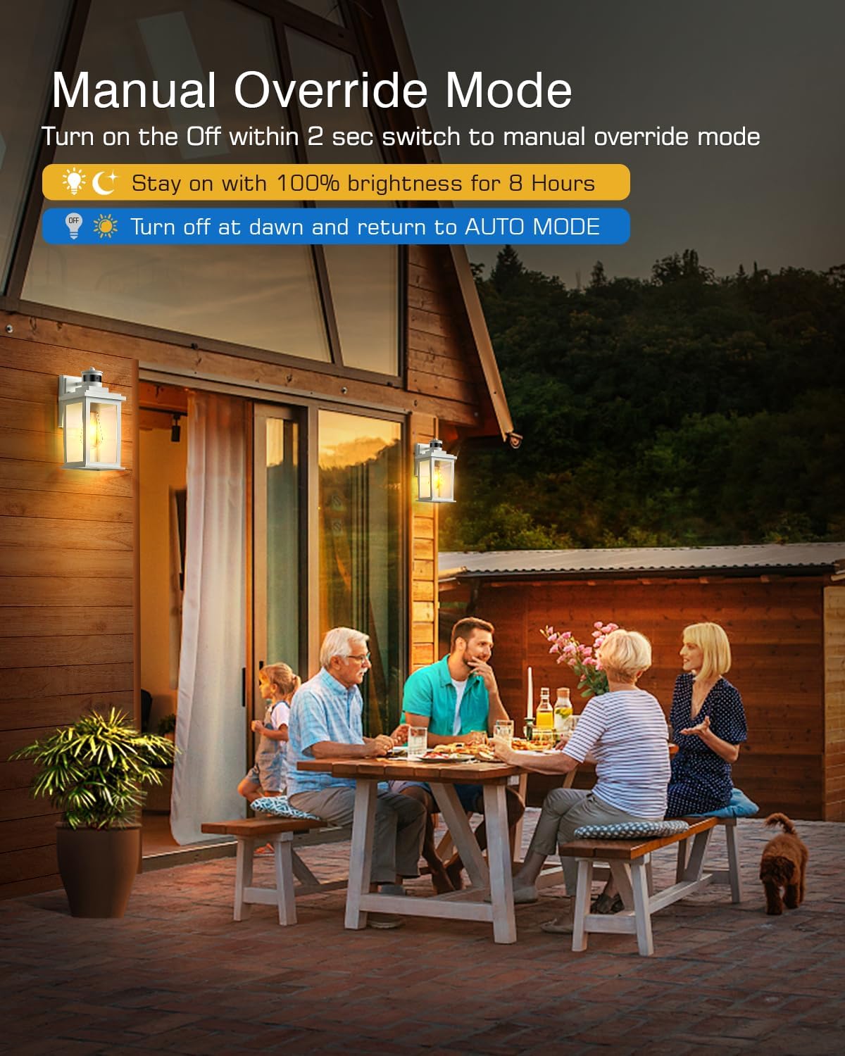 - Upgraded Motion Sensor: Experience latest in technology with motion sensor porch light! ①DIM MODE: 100% brightness when motion is detected at night, 30% brightness the rest of time. ②ECO+ MODE: Keeps the lights off at night, turning on at full 100% brightness when motion is detected. ③D2D Mode: 100% brightness at night, turns off automatically at dawn. ④Override Mode: Maintains 100% brightness for approximately 8 hours, but automatically turns off at dawn.