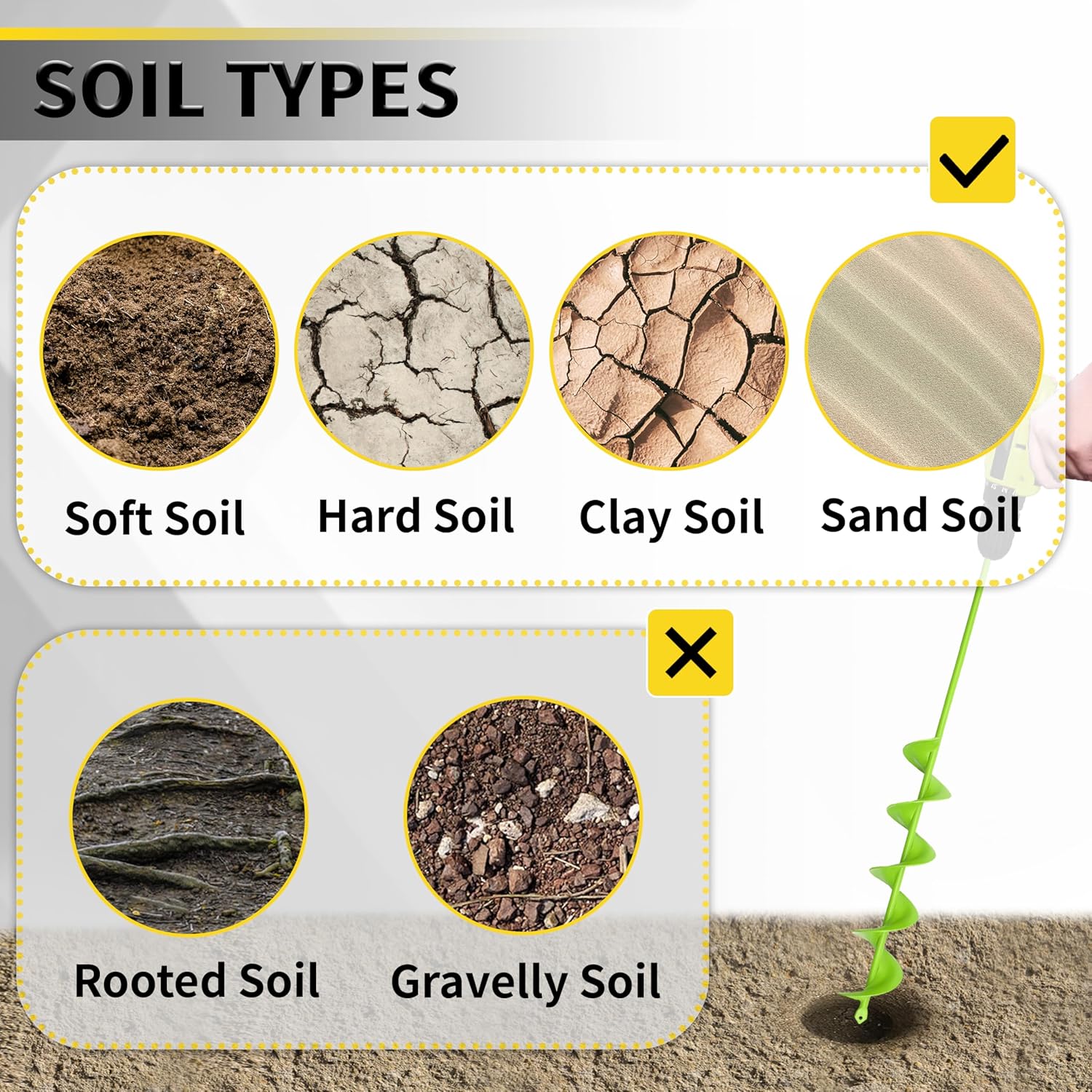 - 【Easily Use】Just insert the planting auger into the drill chuck, tighten and lock it, then hold with both hands, start digging. Reserve the drill transport the soil to edge, you will get the perfect holes you wanted. Suggest using 18V or greater cordless drill with adjustable drill chuck.