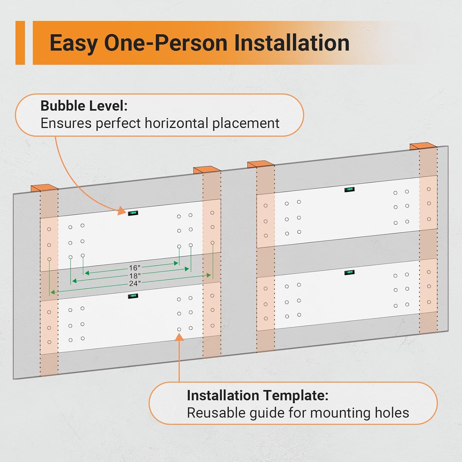 - Adjustable Spacing Design: Compatible with different stud spacing and wall types such as wood studs/joists and concrete walls (cannot be installed on metal walls) and can be used with wood stud spacing of 16", 18" or 24".