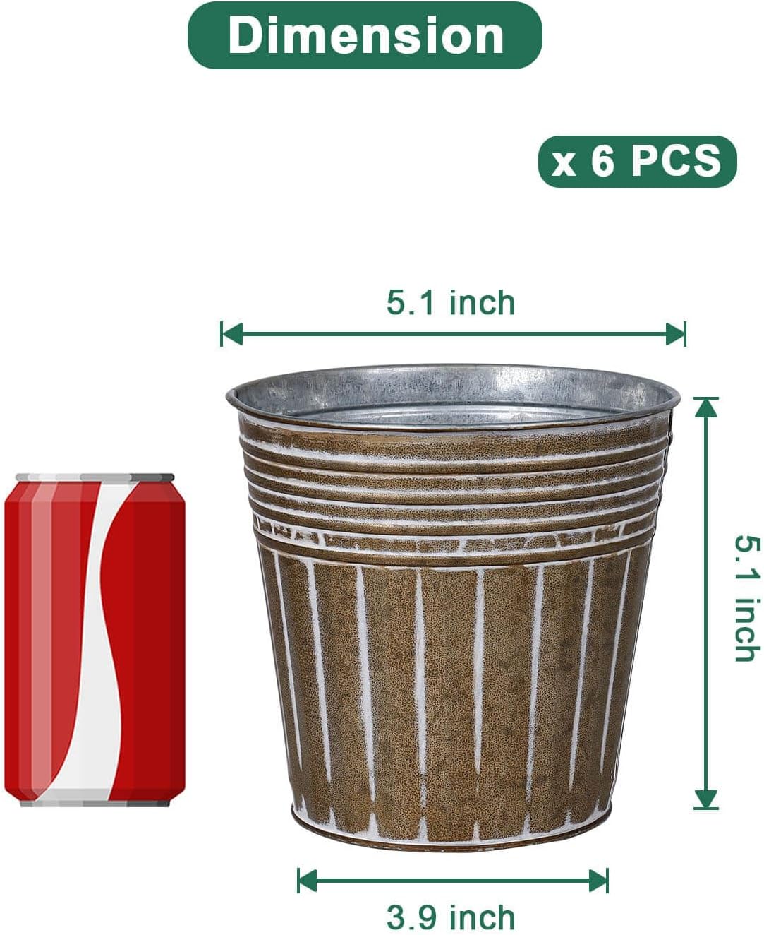 - 【Size of Metal Flower Pots】There are 6pcs metal planters in a package. The topper opening diameter 5.1 inches, the bottom diameter 3.9 inches, and the barrel height is 5.1 inches. These tin buckets have ample space for plant growth, making them ideal for succulents, herbs, and flowers, keeping your greenery vibrant.