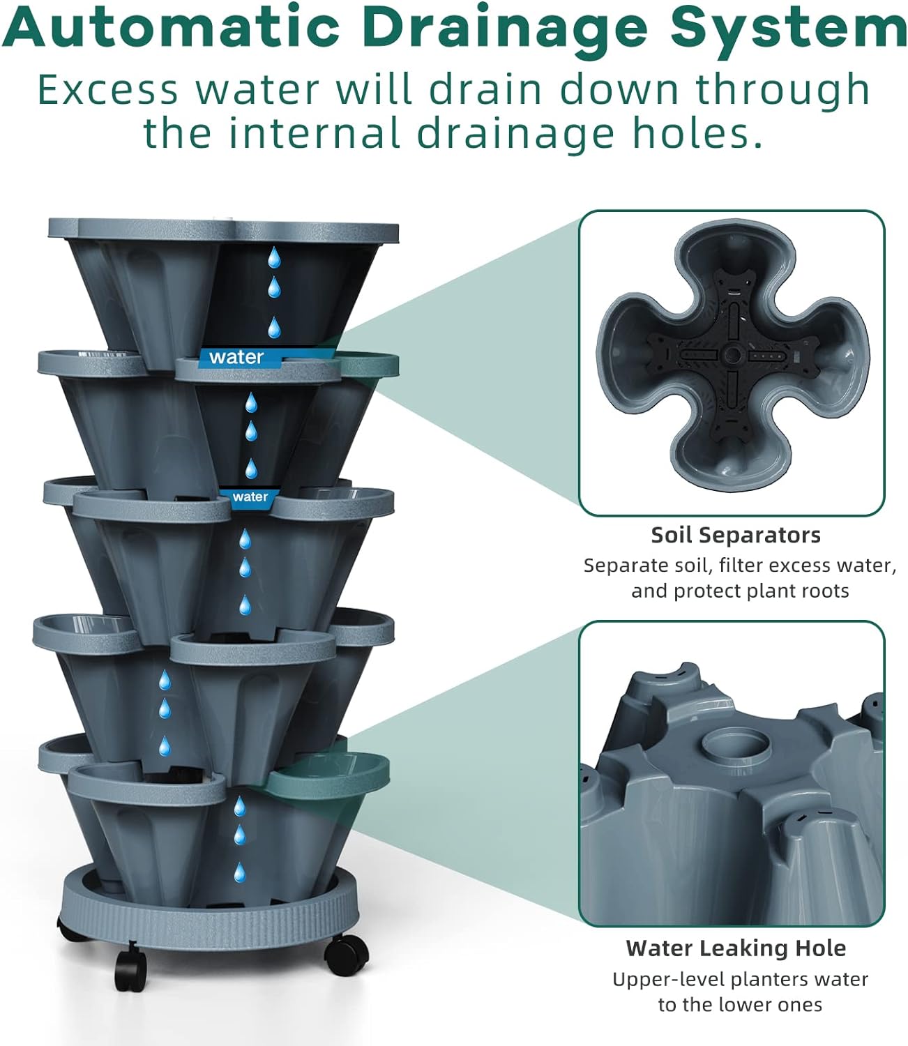 - 5 Tier Vertical Planter - 5 tier stacking planter, made of BPA-free material, can hold up to 20 different plants, such as strawberries, spinach, leaf lettuce, arugula, and mustard greens, and a few smaller herbs and flowers. Plus, it's the perfect vessel for strawberries as the berries cascade over the container lip.