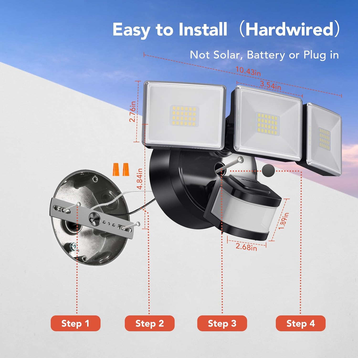 - 【IP65 Waterproof & 2 Ways to Install】The motion sensor light has passed the rigorous testing of IP65 waterproof to resist rain, dust and snow. The polycarbonate material has excellent performance of heat dissipation, high-temperature resistance, frost resistance, anti-UV and anti-breakage, supporting 50,000 hours lighting time. The light is easy to install with both wall mounting and soffit mounting ways.