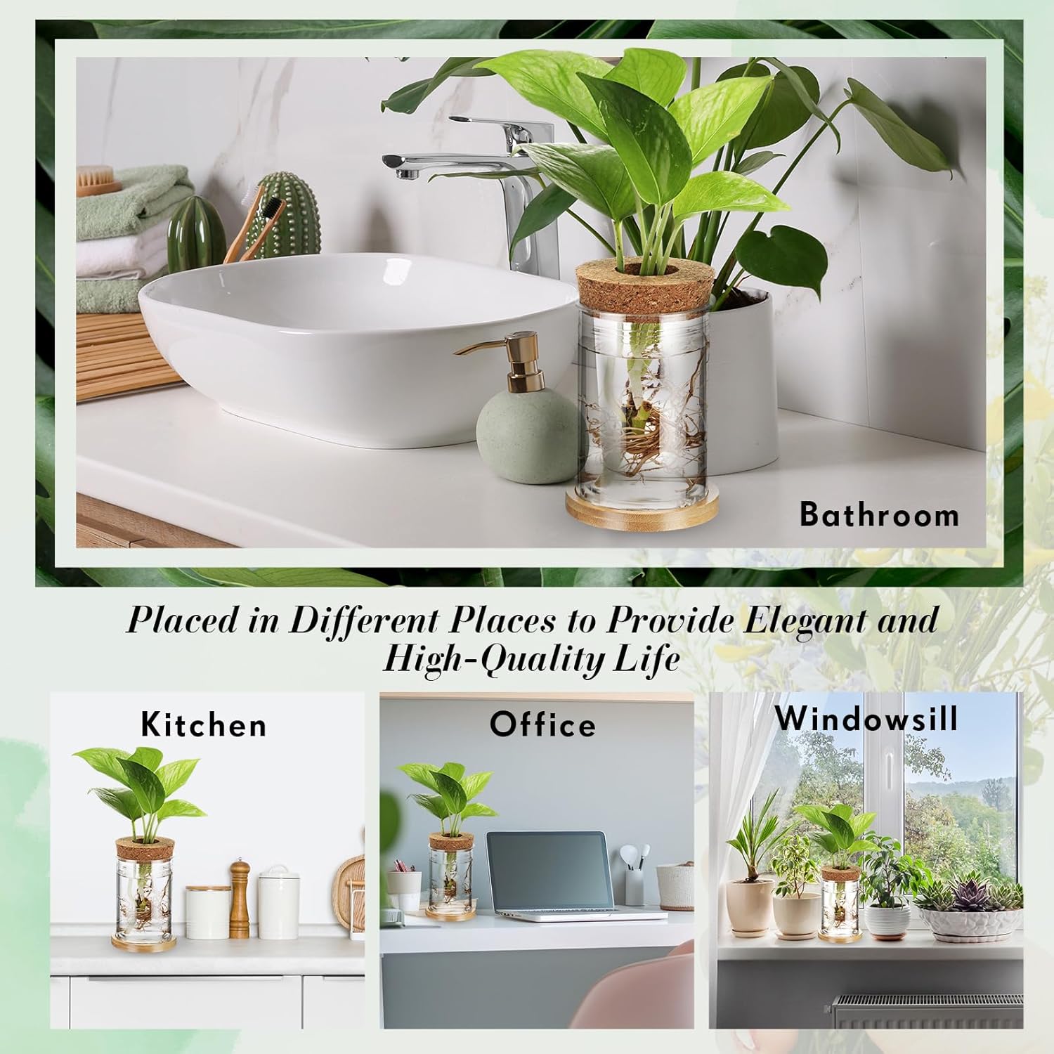 - Reliable Materials: plants propagation vases are made of plastic, not easy to break or be fragile; Cork toppers are made of wood, preventing excessive water evaporation, independent bamboo saucers are made of bamboo, suitable for home, adding a touch of natural charm to settings