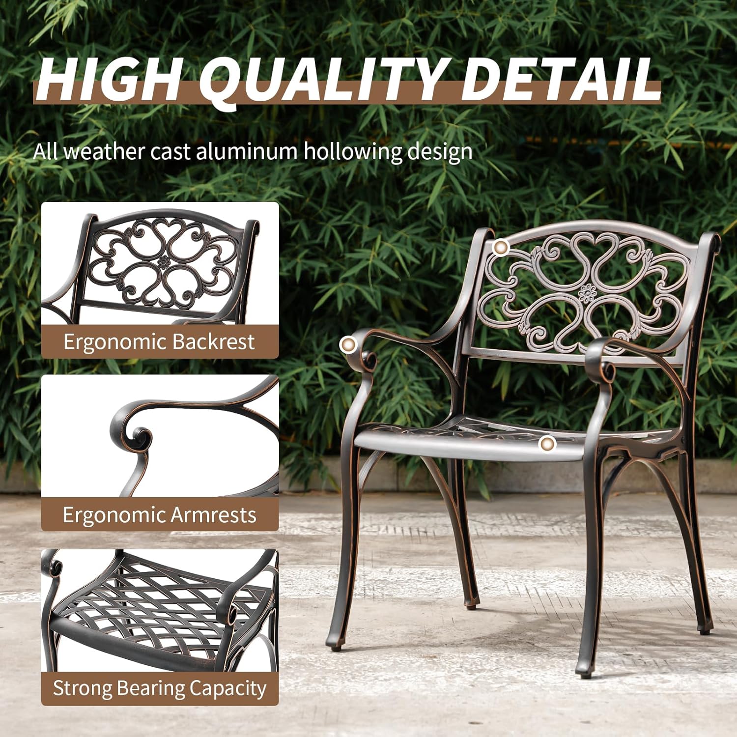 - 5 Piece Bistro Set Outdoor: Our dining set will meet all of your outdoor furniture needs. This bistro set includes 4 chairs and a round table with a beautiful bronze color, adding style to your space without sacrificing comfort. The chairs fit perfectly around the table for backyard family dining and picnics or take a rest.