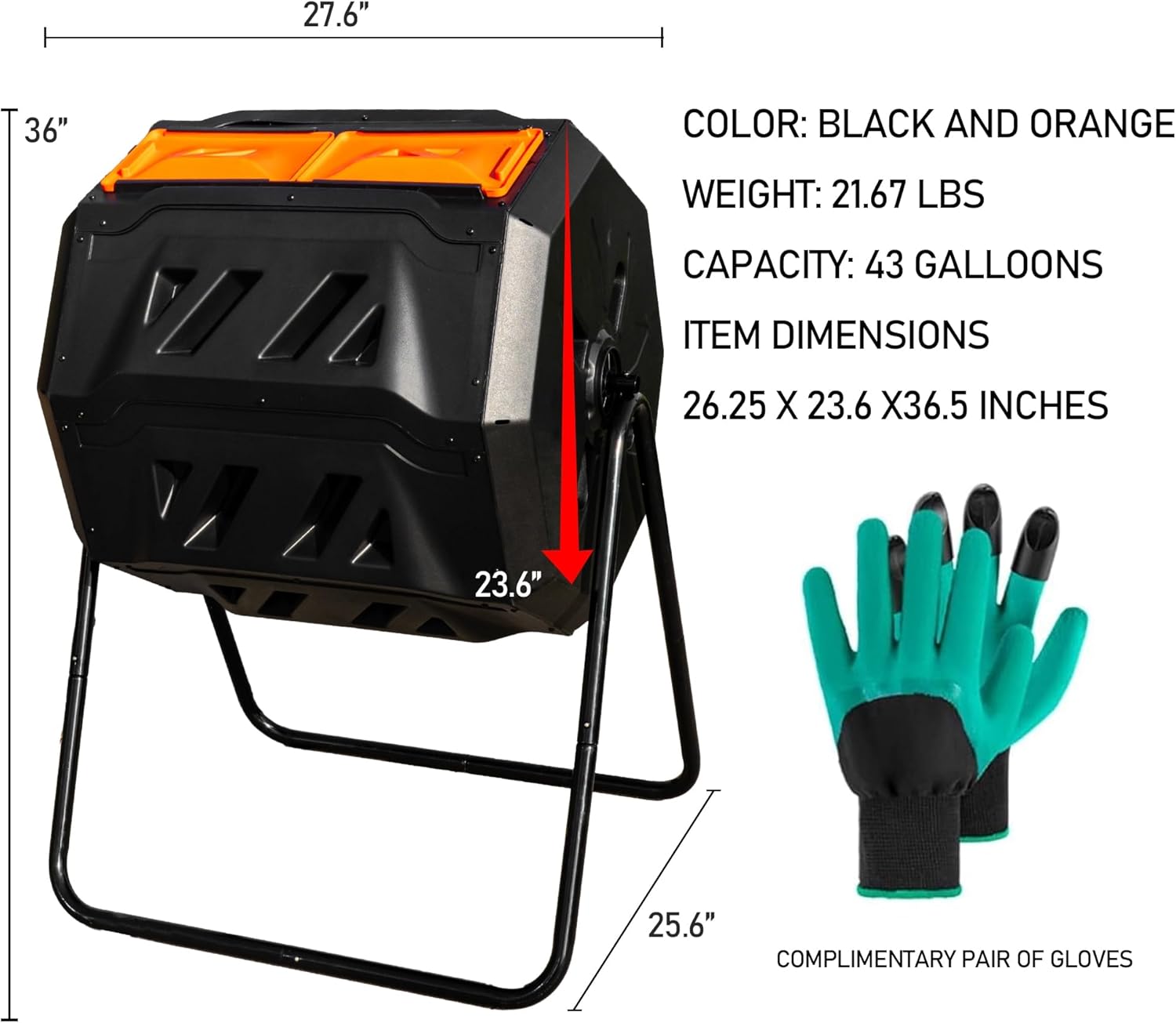 - 43 Gal Dual Chamber Composter: This 43 gallons composter with dimensions of 27.6 × 25.8 × 36 inch. This large tumbling composter makes recycling kitchen scraps a breeze.