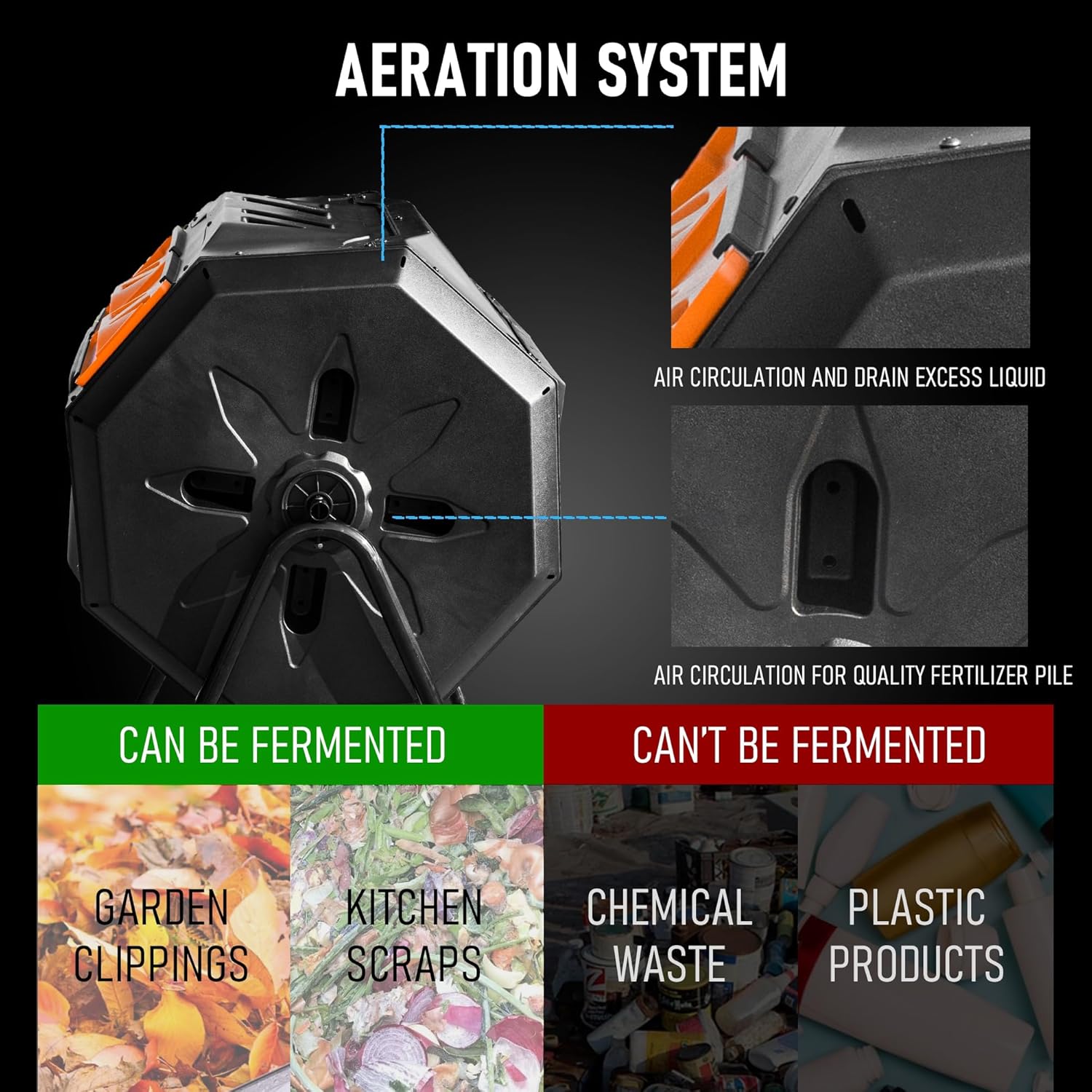 - 360° Tumbling Design: Gone are the days of manually stirring and digging into your compost pile. Deep flaps on panels and in deep grooves combine to smoothly rotate the compost bin and promote the compost process. The large openings and removable door ease the addition of scraps or clippings and the removal of completed compost.