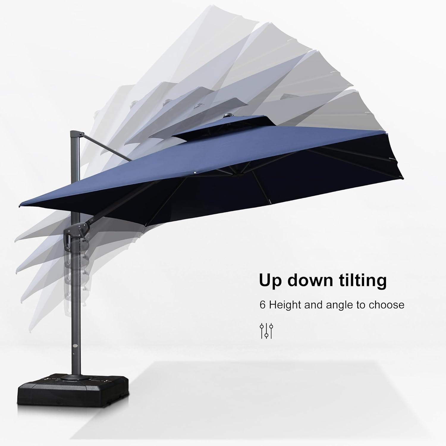 - ROTATION & TILTING: This cantilever umbrella can be rotated 360 degrees easily, in addition, the 6-level adjustable tilt operation system also makes tilting the deck umbrella effortless