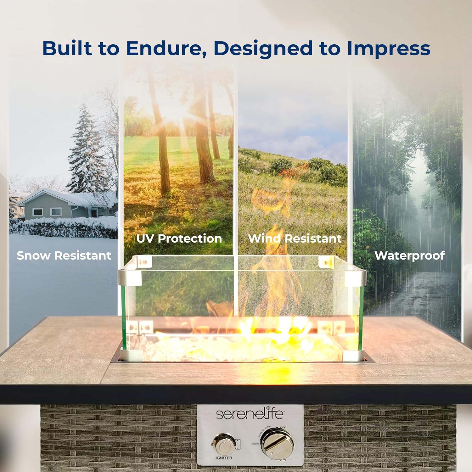 - MADE TO LAST: This sturdy outdoor propane gas fire pit table features weather-resistant heavy-duty steel + PE wicker + stainless steel construction materials & comes w/ a protective cover to protect it from rain, & dust