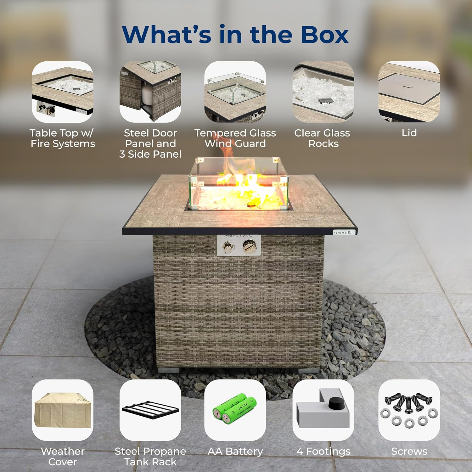 SereneLife Outdoor Propane Fire Pit Table - CSA/ETL Certified Safe 50,000 BTU Pulse Ignition Weatherproof Square Wicker Propane Gas Fire Table w/Tile Tabletop Adjustable Flame - Glass Rocks