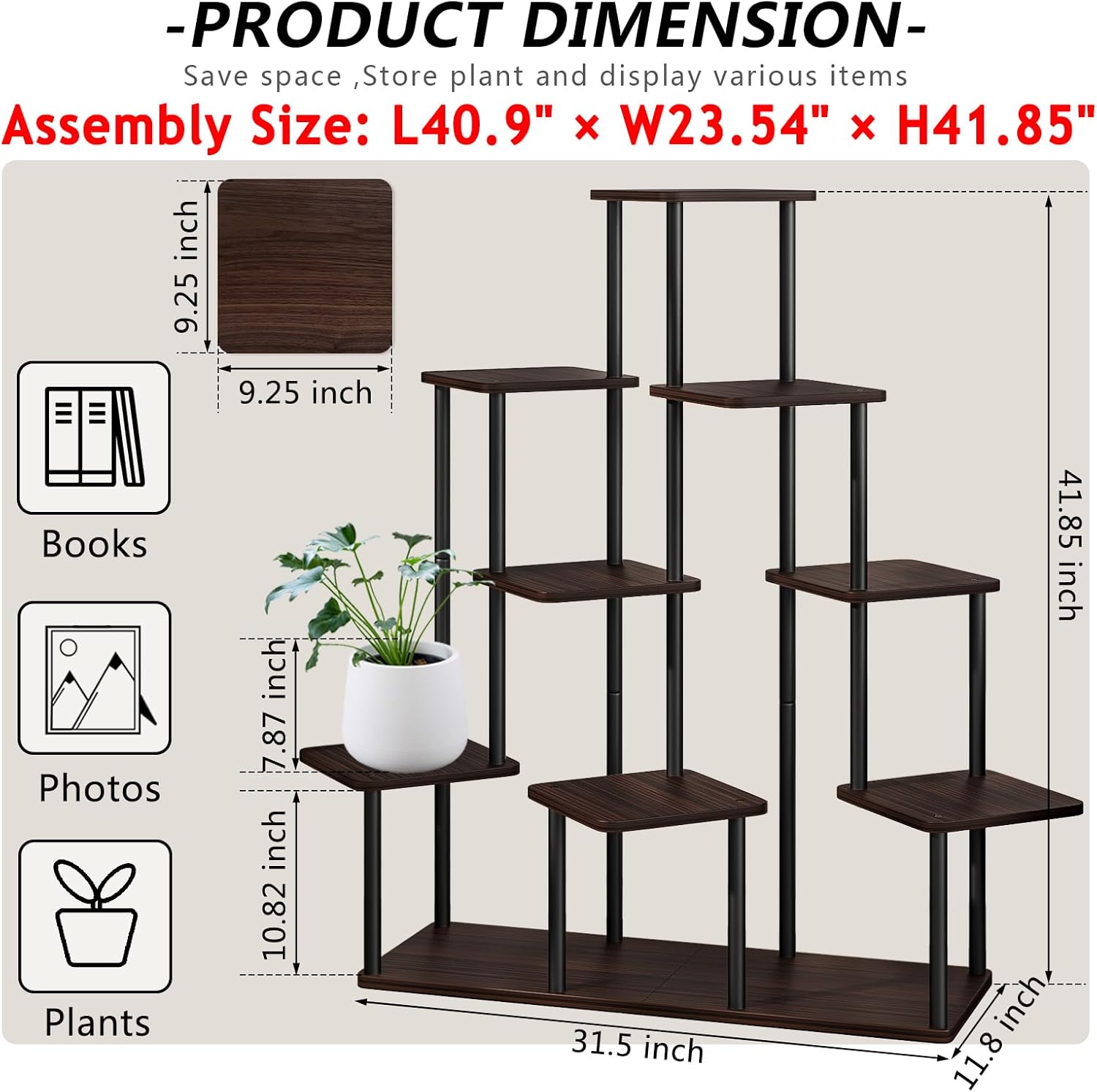 - 【9 Tier Tall Plant Shelf】The indoor plant stand 12 pots of plants can be placed, 42.94(L) x 23.54(W) x 41.85(H) inches,perfect for flower pots of various sizes and shapes, each plant can soak up sufficient sunlight to thrive. In addition to showcasing your lovely plant, you can also use it for your pictures or memorable knickknacks.