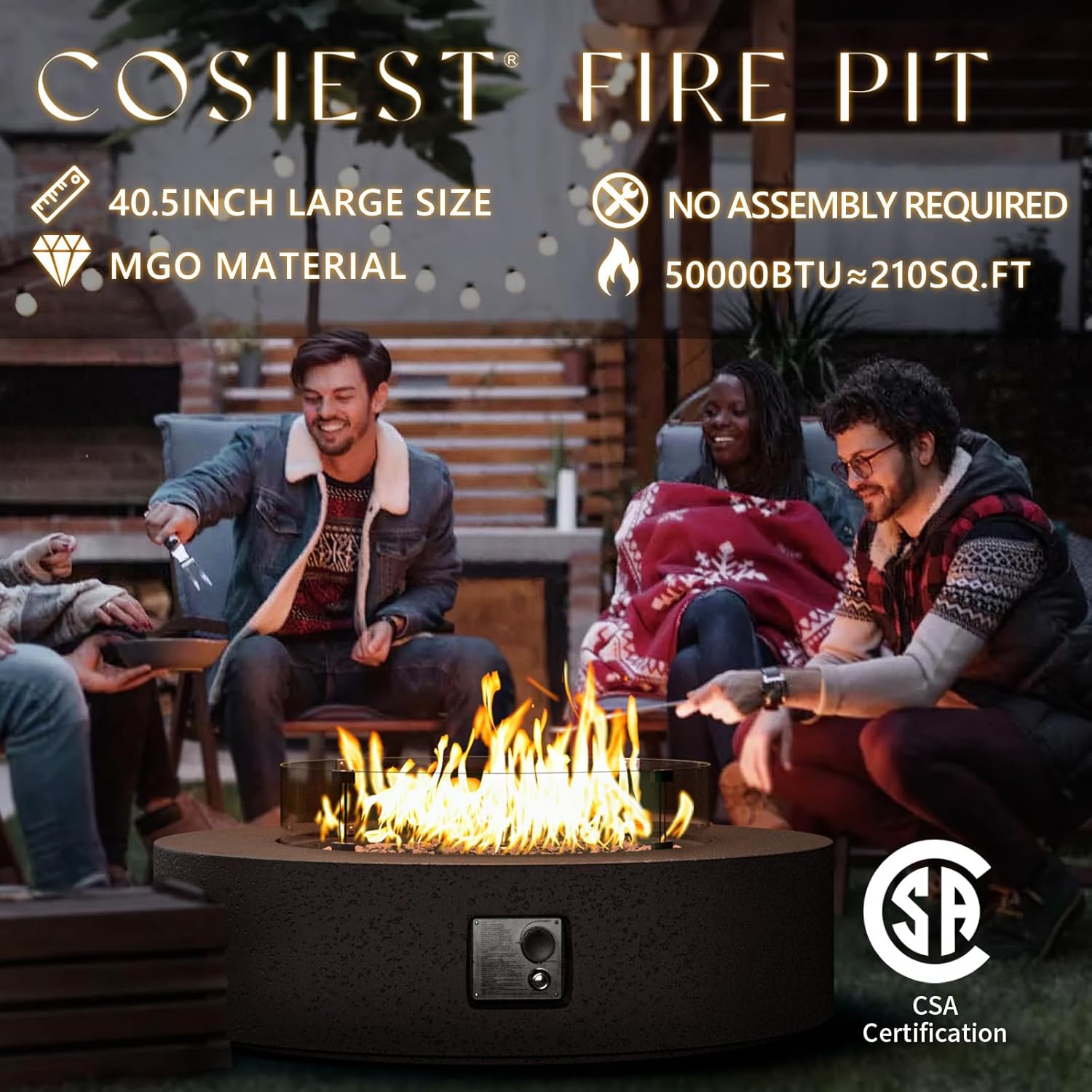 COSIEST 42 inch Outdoor Propane Fire Pit Coffee Table w Concrete Round Base Patio Heater, CSA Certified, 50,000 BTU Stainless Steel Burner, Free Lava Rocks, Rain Cover, Wind Guard, Tank Cover