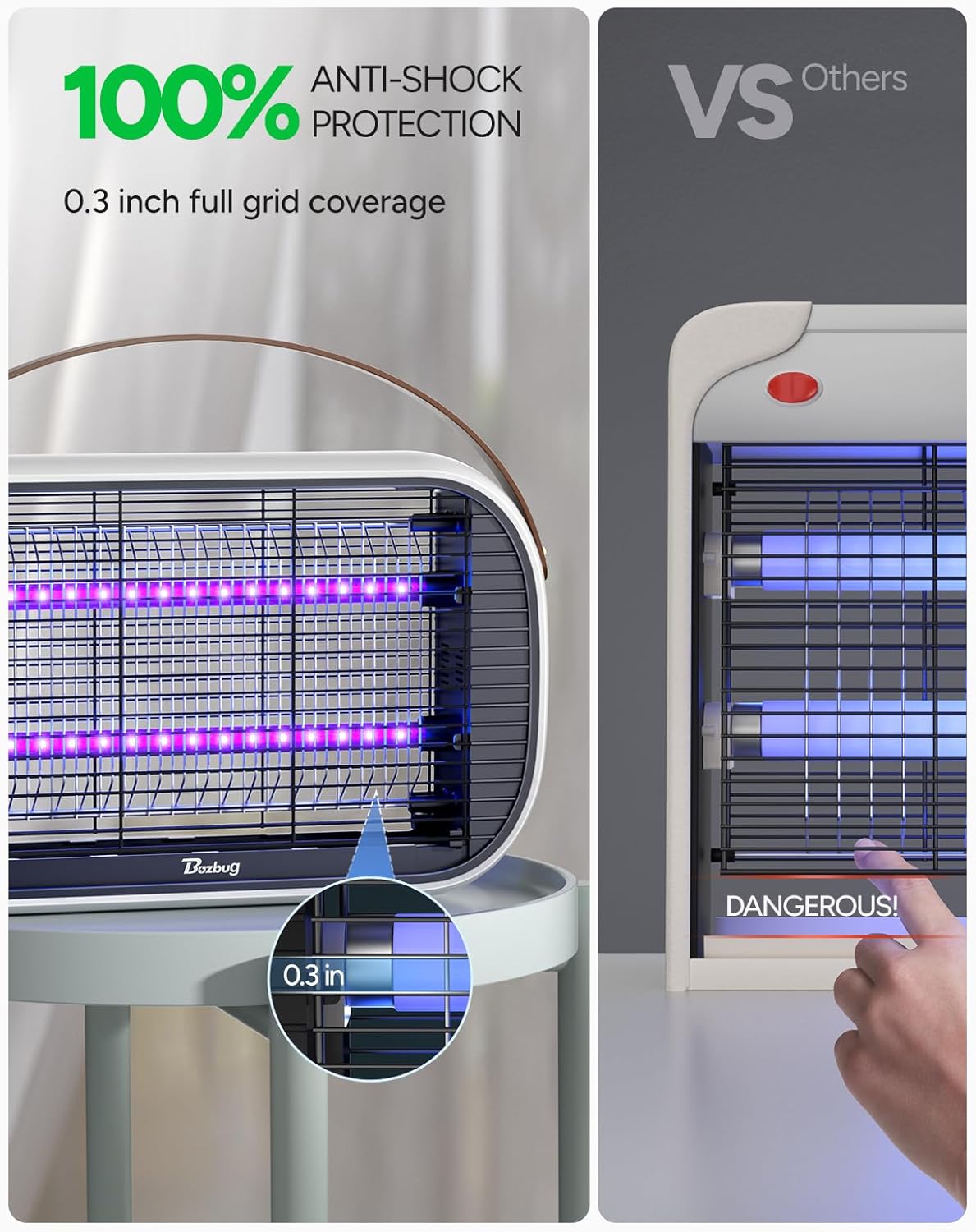 - 360Β° All-round Protection: There is a dense protective net on the outside of the product to prevent fingers from entering the inside of the device. ABS insulated plastic case to prevent electric shock. The product kills insects physically and emits no odors or smoke. There is a power switch on the right side of the zapper, which can easily cut off the power.