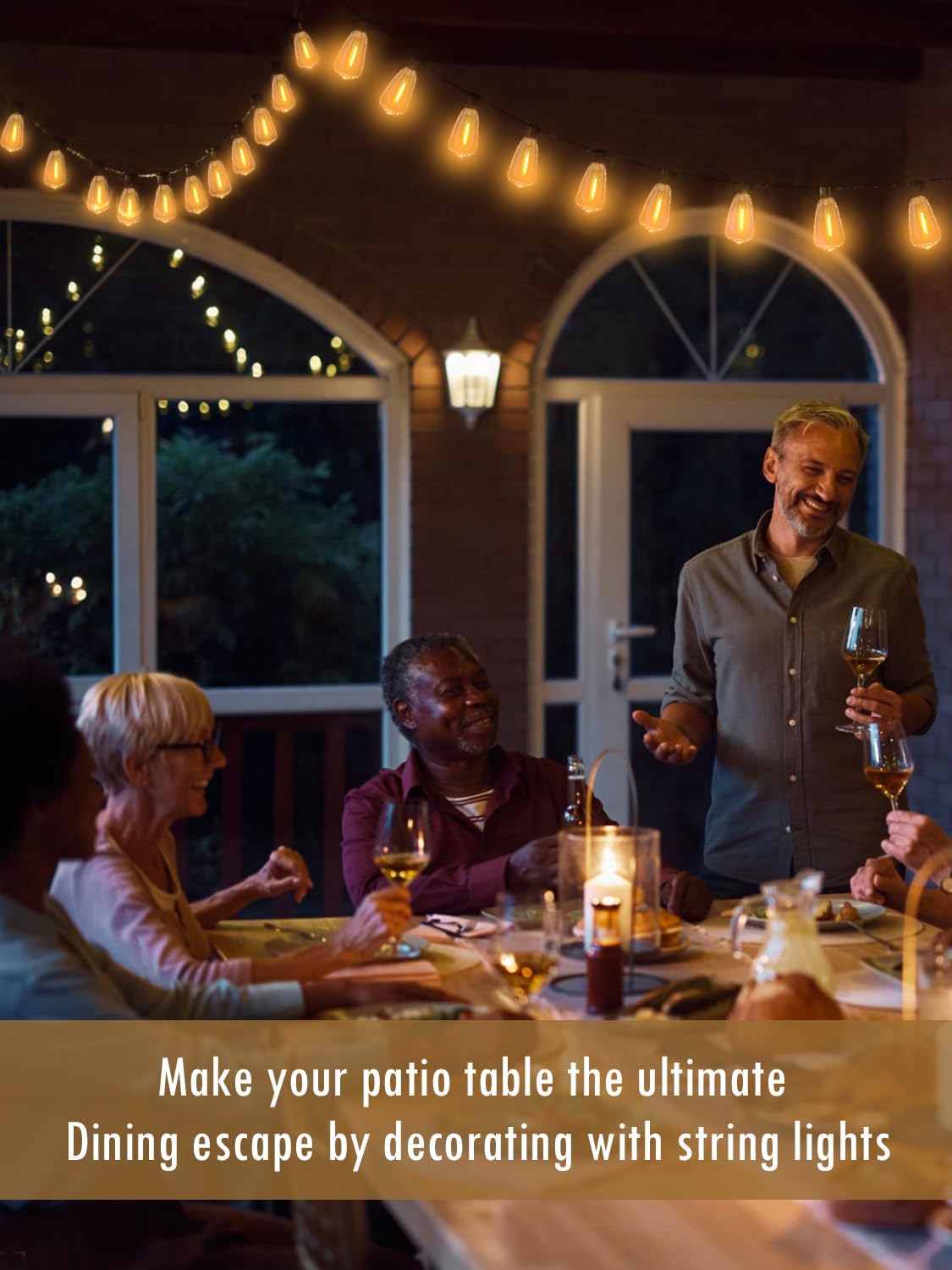 - ăConnectable&Easy install LED string lightsă- Attach hooks every socket along the pole or fence and hang the patio string lights. Perfect for illuminating garden or creating a cozy seating area. these patio lights can have up to 15 strings connected end-to-end and can easily light up a large backyard party or camping wedding. If have an outdoor patio, string up lights across area,enhance gazebo's charm with stunning range of outdoor patio lights,with bright porch light once the sun goes down.