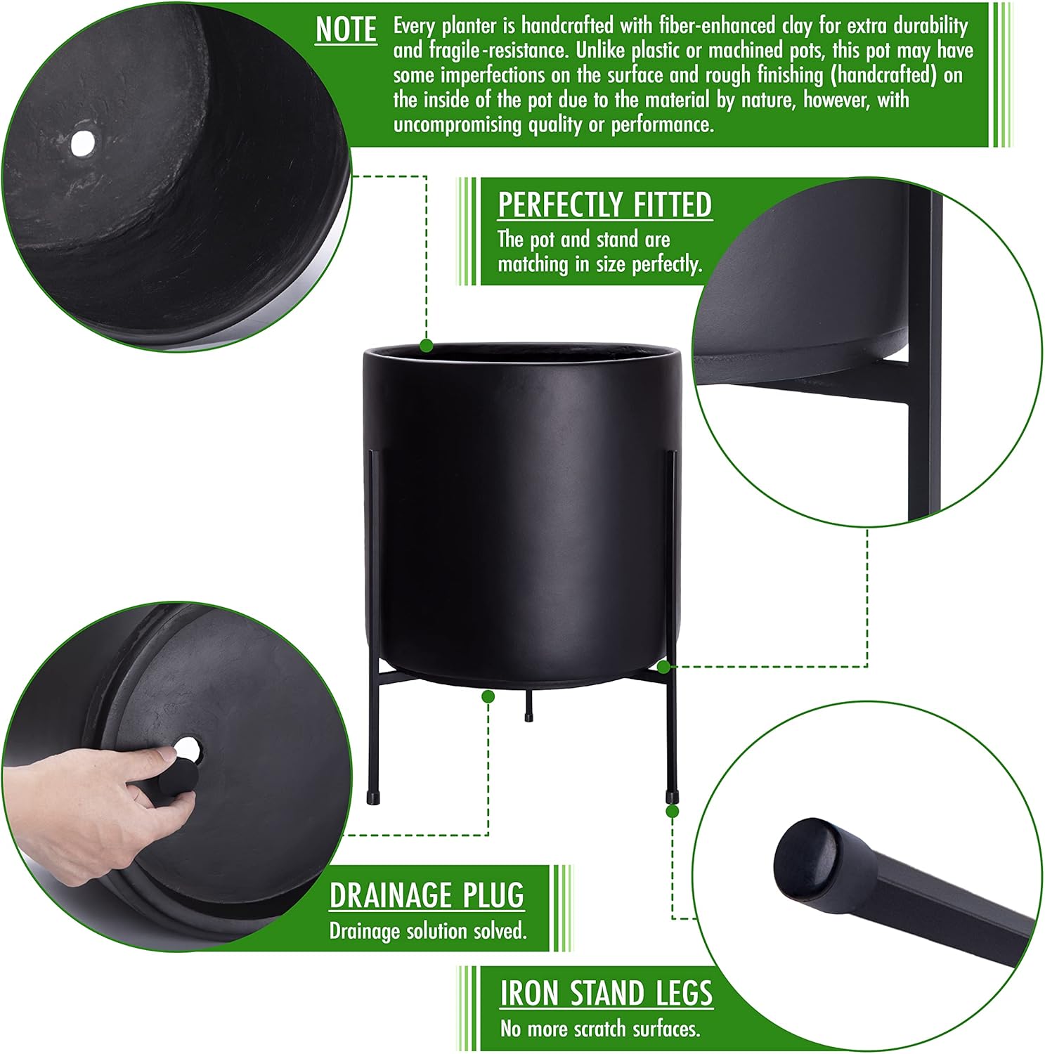 - Simple and Elegant Design: Cylinder-shaped pot is simple and elegant. Black color matches well with any plant and decor. Sleek and minimalist stand adds sophistication to your space.