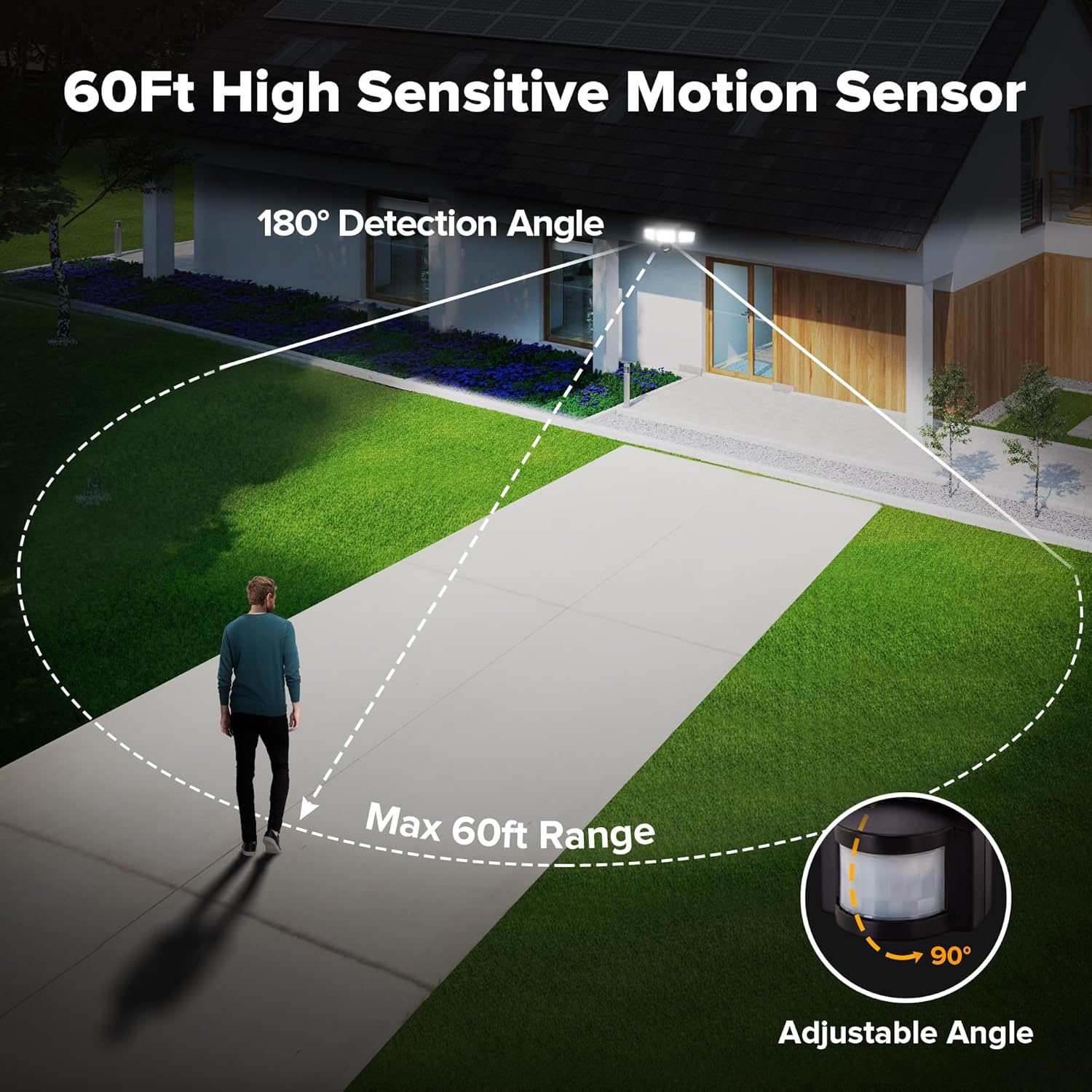 - 【Solar Motion Sensor Light with 60FT Detection Distance】UME solar motion sensor light is equipped a upgraded motion sensor , providing a wide detecting angle of 180 degrees and detecting distance of up to 60 feet. This design allows for more sensitive motion detection across a broader range, catering to your heightened usage requirements and a wider array of application scenarios.