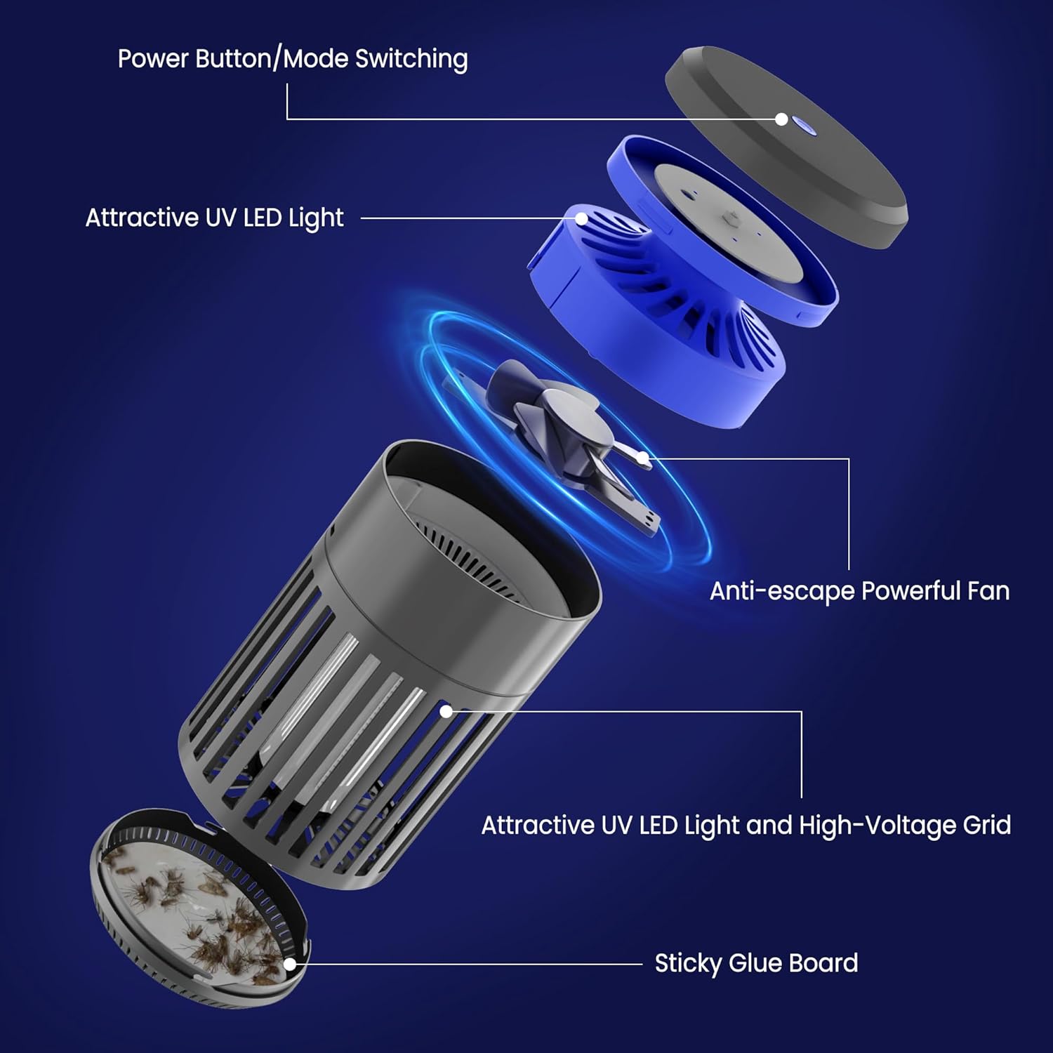 - 3-in-1 device : Features 3 powerful modes for effective pest control. Mode 1 (1 press): Fan + Sticky Paper—top UV light attracts bugs, fan sucks them into the bottom trap (requires included sticky paper). Mode 2 (2 presses): Electric Zapper—middle light lures insects, high-voltage grid eliminates them instantly. Mode 3 (3 presses): Dual Action—both lights, fan, and zapper work together for max coverage and efficiency. Note: Always use sticky paper in fan-involved modes to trap bugs securely.