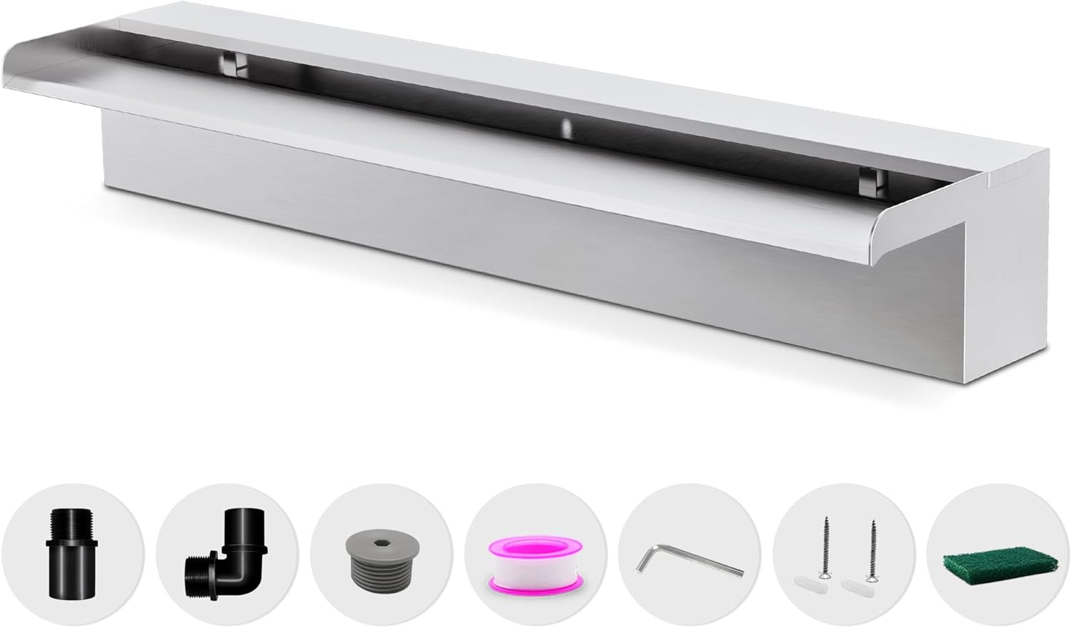 - ăAnti-Rust Spillway Waterfallă- Our welded in one body one-piece 304 stainless steel construction of this spillway waterfall provides long-lasting strength, rust resistance, and leakproof performance. The open lip design creates an elegant freefalling waterfall that adds decorative flair to ponds and pools. The soothing sound of the cascading water promotes relaxation and tranquility. LED light strips not included, but available separately.