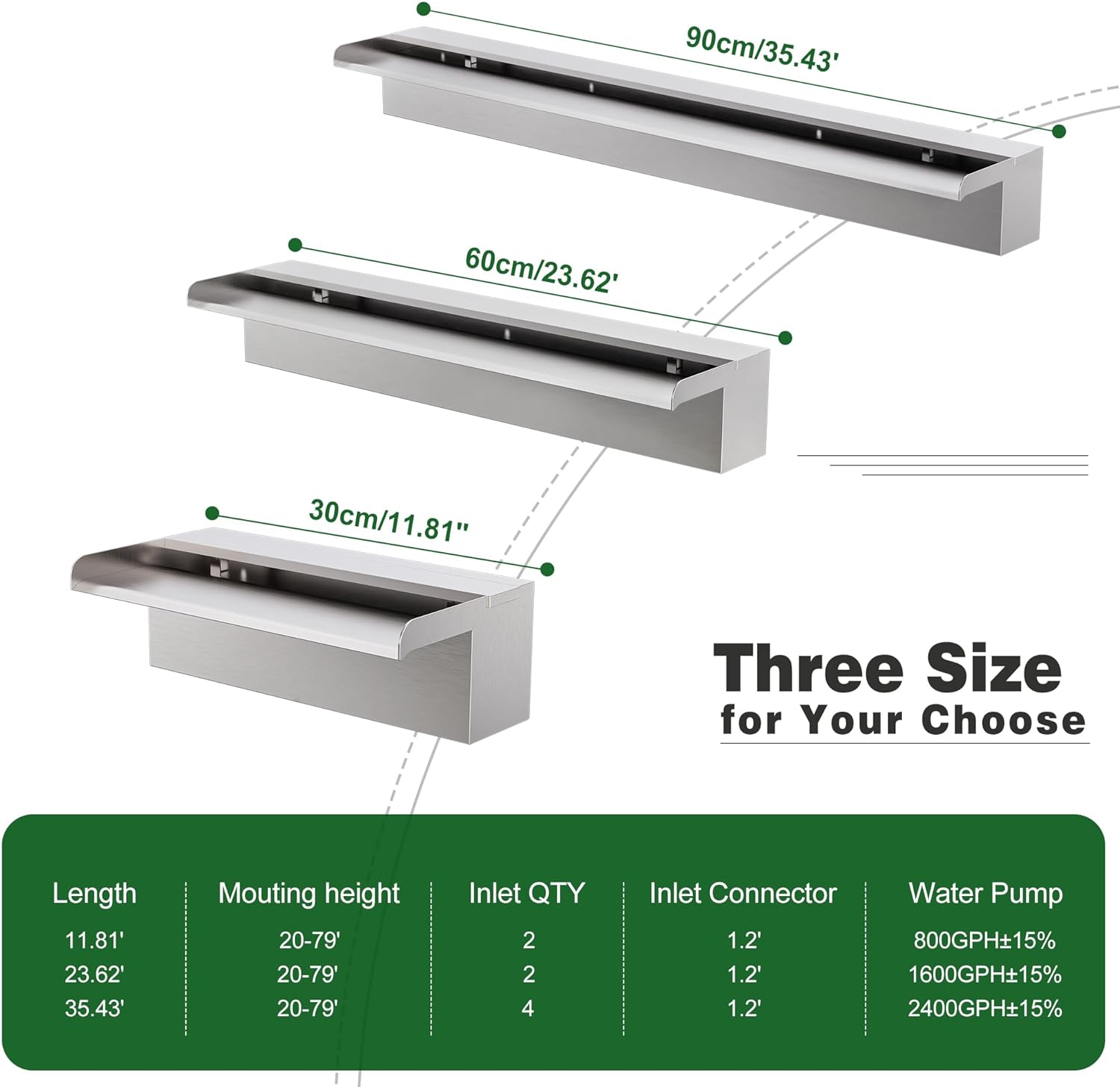 Waterfall Pool Fountain LONGRUNNEW 304 Stainless Steel 23.6" Rectangular Waterfall Spillway, Water Fall Fountain with Pipe Connector for Garden Outdoor, Swimming Pools, Fountains, Pond and Spa