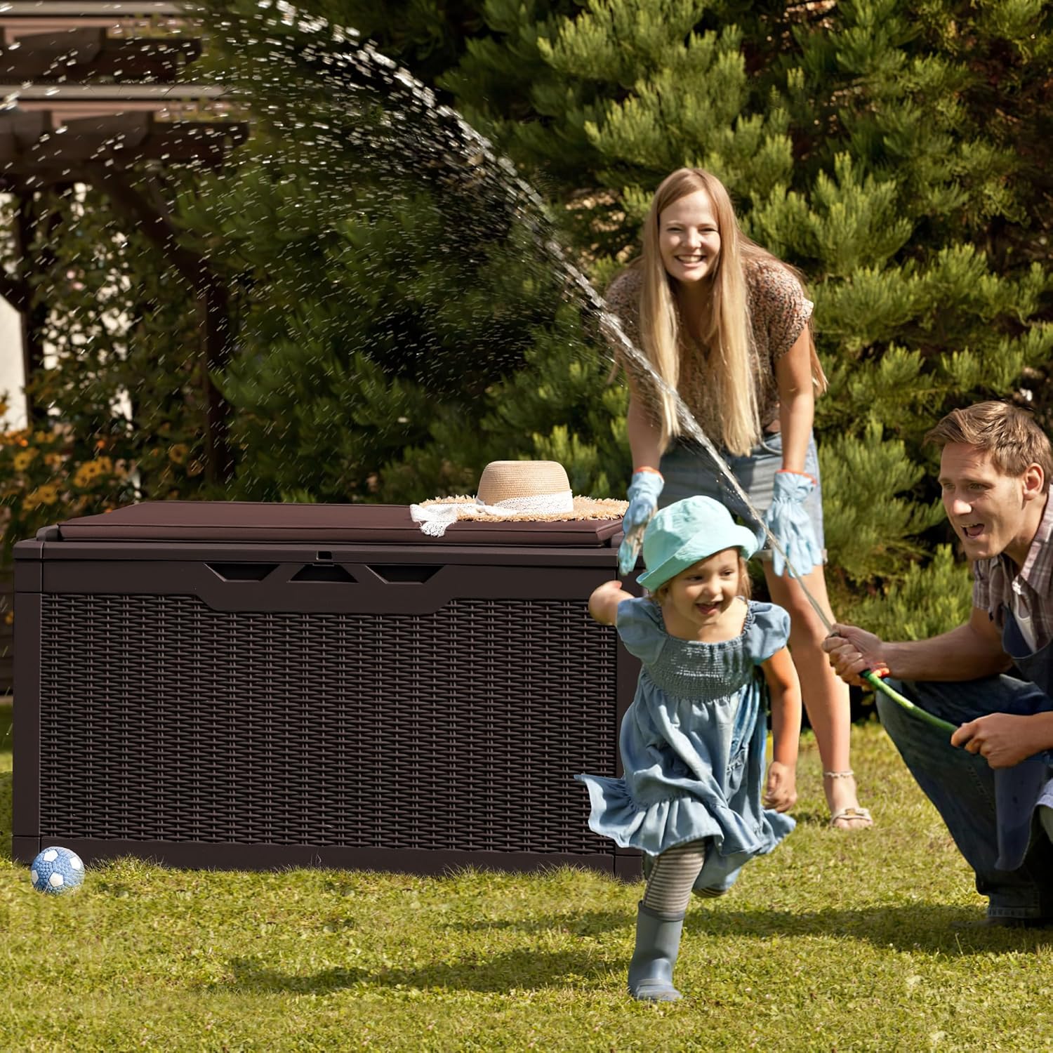 Greesum 100 Gallon Resin Deck Box Large Outdoor Storage Boxes with Cushions for Garden Tools, Patio Furniture Pillows, Pool Supplies, Dark Brown