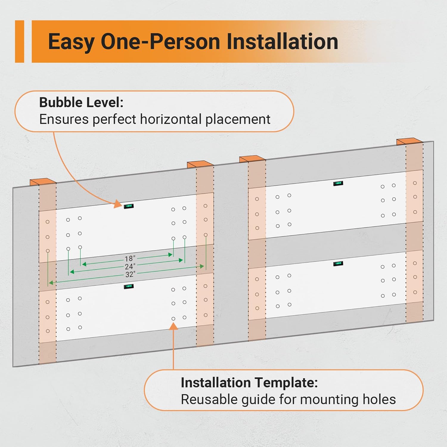 - Adjustable Spacing Design: Compatible with different stud spacing and wall types such as wood studs/joists and concrete walls (cannot be installed on metal walls) and can be used with wood stud spacing of 18", 24" or 32" .