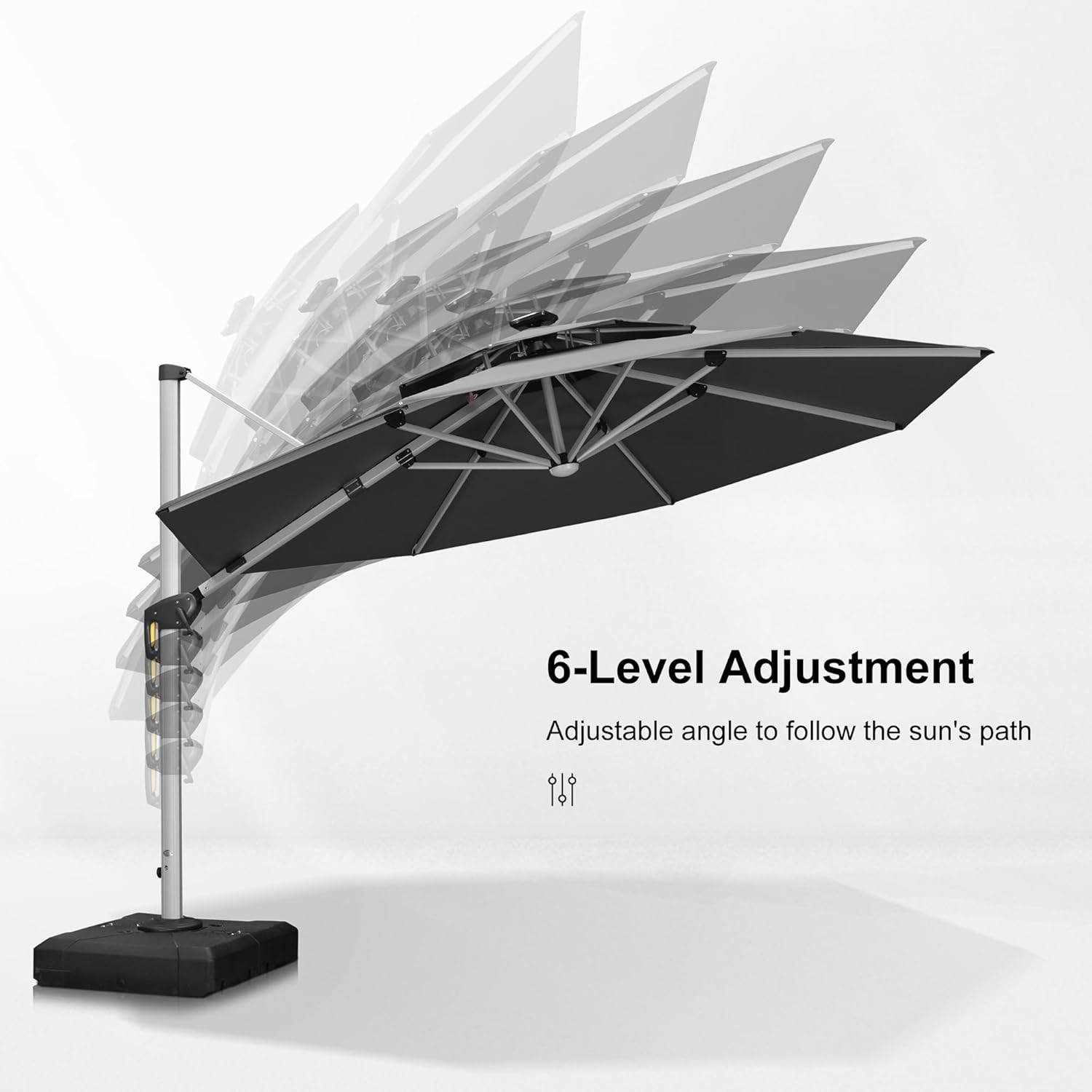 - The cantilever umbrella includes a weighted base