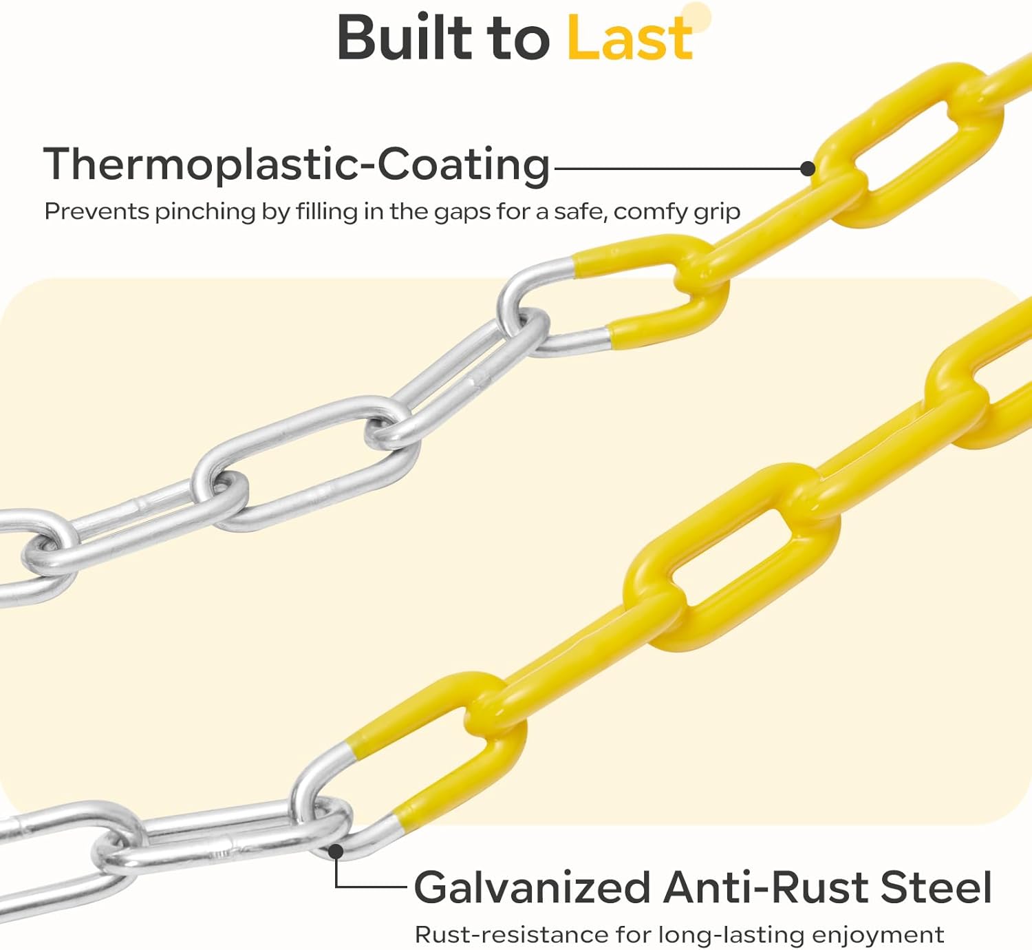 - 【 Anti-Rust Coated Chains 】Decorlife swing set include two 66 inch long zinc-plated heavy duty chains, 30 inch of which covered thermoplastic coating (industry-leading 0.5mm thickness) to prevent finger pinches no hair snags or tangles and resist rain/snow corrosion.