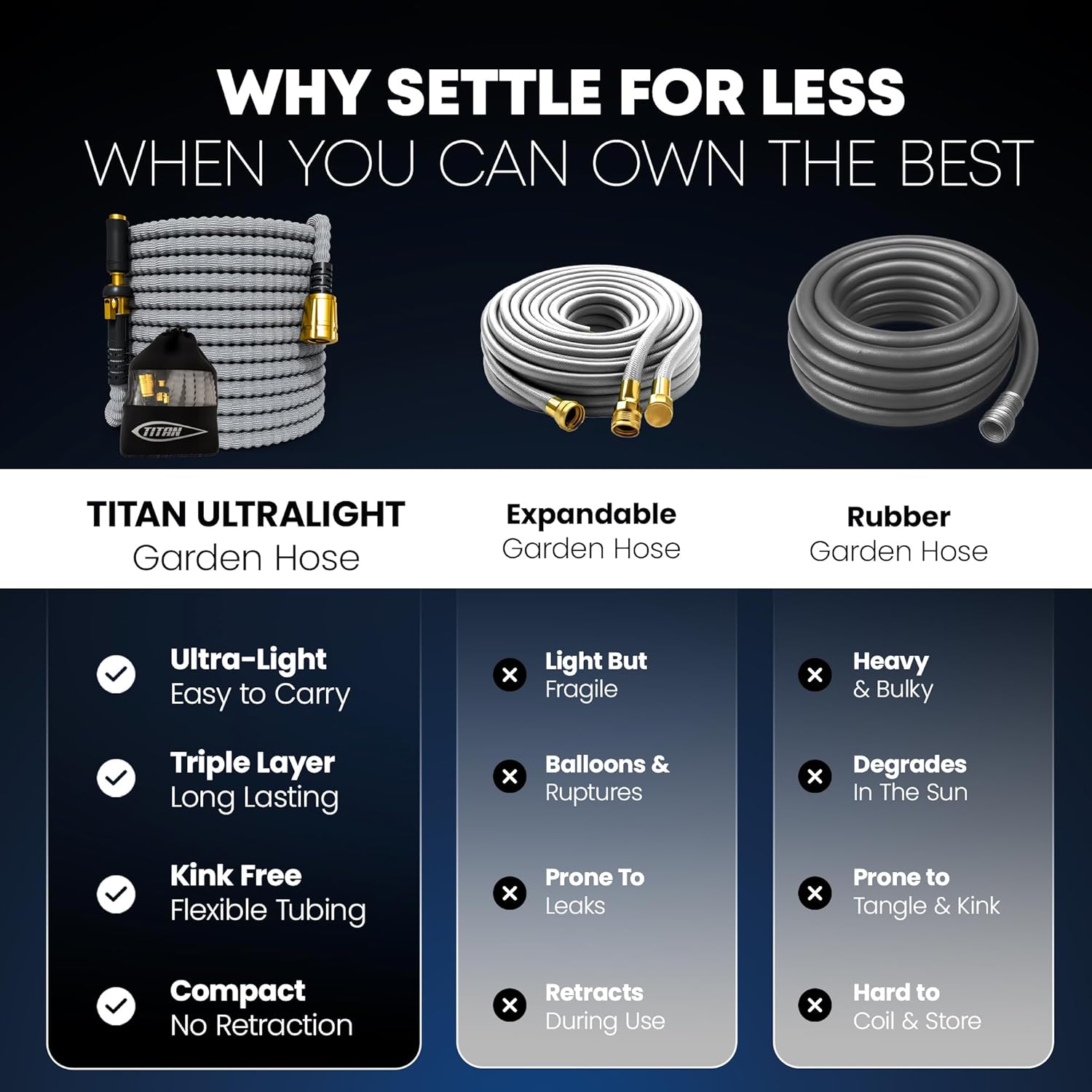 - [Ultra-Lightweight & Durable] Introducing the Titan Ultra Light Garden Hose, revolutionizing your gardening with its ultra lightweight design. This full-length hose boasts a pioneering three-layer construction, offering unparalleled lightness for effortless maneuverability and storage. Perfect for those seeking the lightest possible garden hose without compromising on durability.