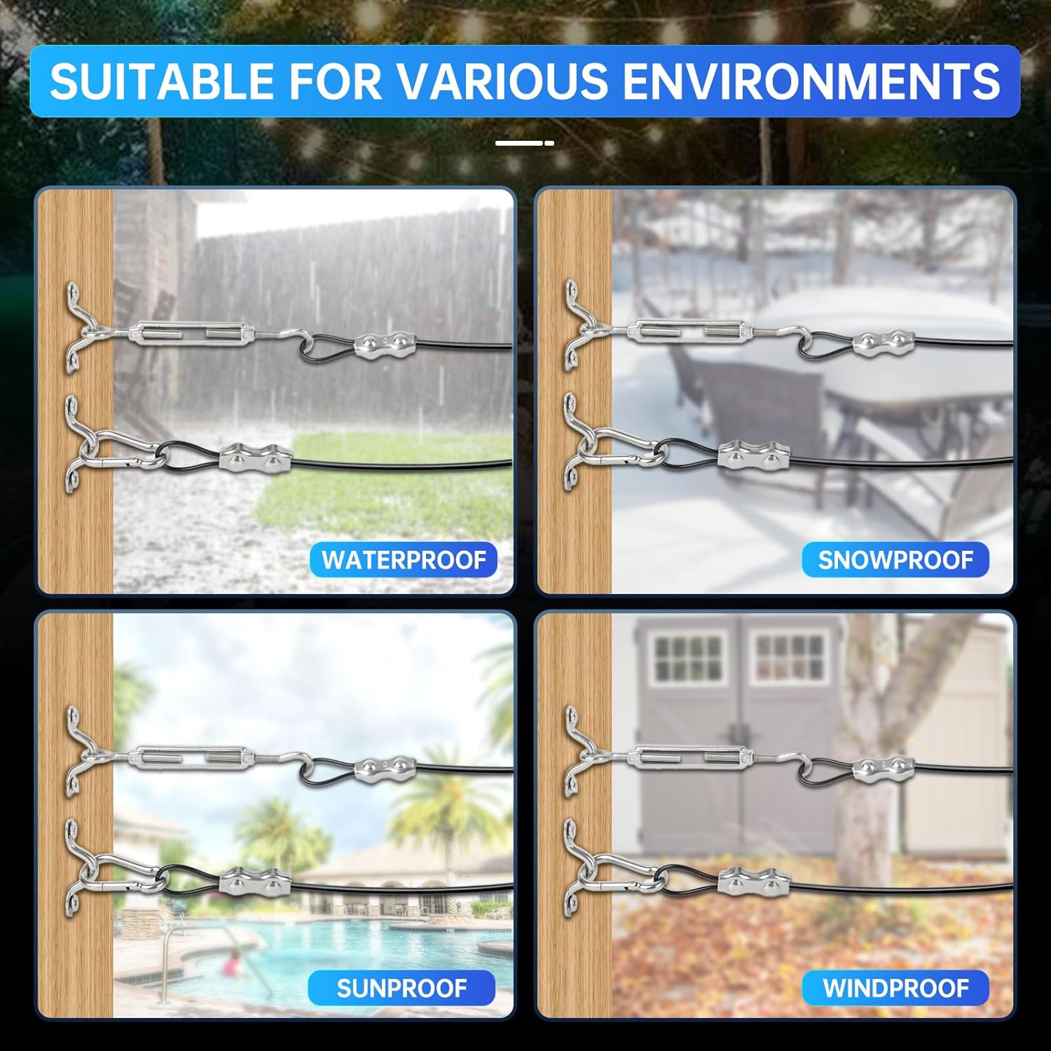 - Multi-Application Flexibility:Perfect for both commercial and residential use,Outdoor string light suspension (patio/event lighting),Greenhouse plant support systems Safety railings & gate tensioning, Retail display rigging & curtain track installation DIY projects requiring <1/8" deflection under load