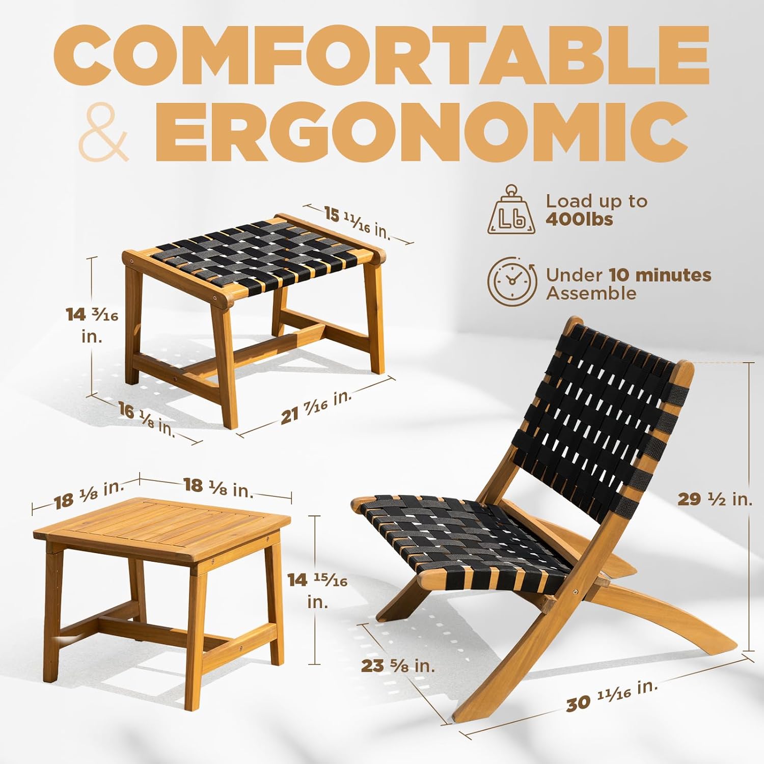 - 『Durable Folding Bistro Set』: Built to withstand the elements, our 3-piece outdoor bistro set boasts a sturdy wooden frame supporting up to 400lbs for chairs and 150lbs for the table. Its foldable design ensures easy storage, making it ideal for any outdoor event or compact spaces.