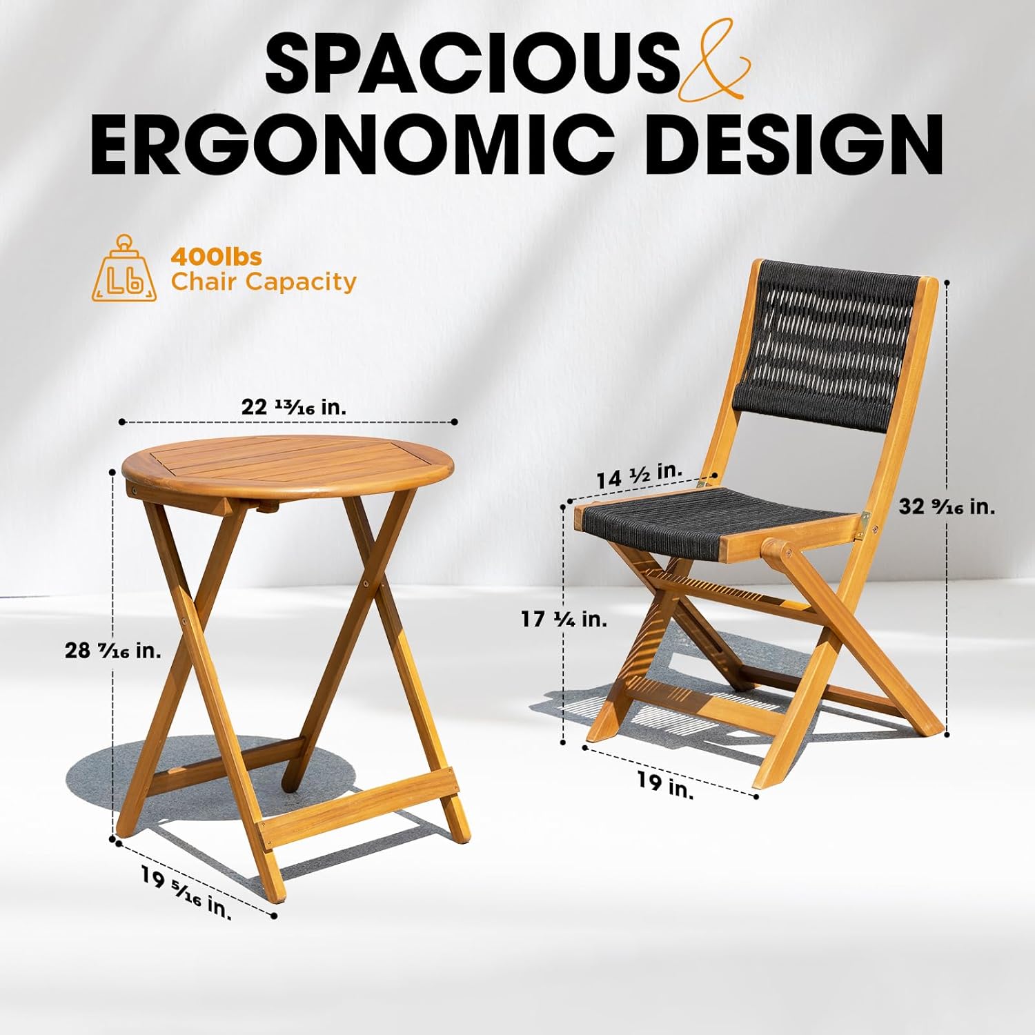 - SIMPLE TO MAINTAIN WITH HIGH QUALITY COATING: This folding bistro set is coated with high-grade oil-based finish that protects the surface from UV rays & harsh weather, ensuring our 3 piece acacia wood patio bistro set keeps in good condition with less effort