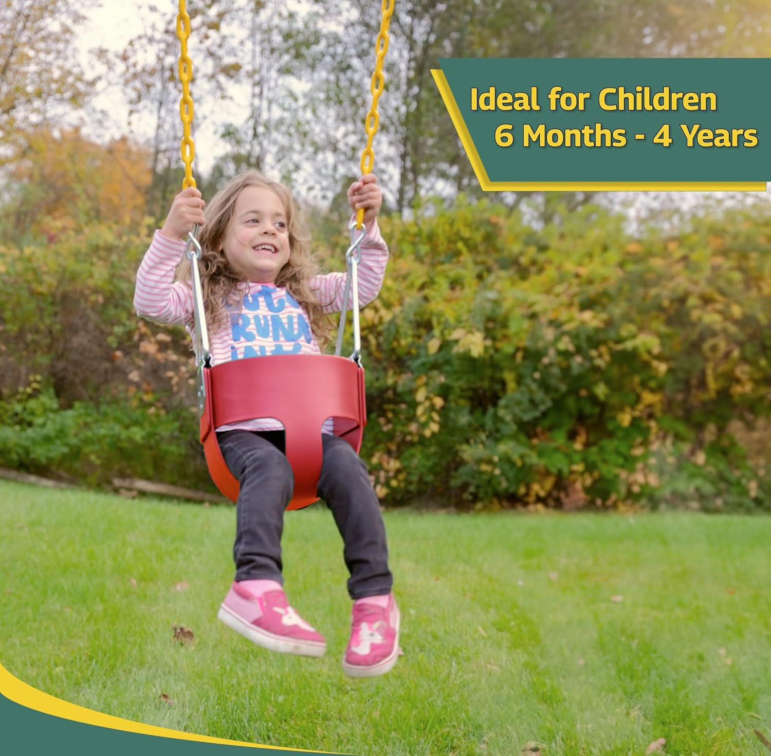 - Comfortable and Safe Chains: The swing chains are approximately 66" long, with the bottom 30" coated in yellow plastisol. This coating ensures a soft, pinch-free grip for ultimate comfort and safety during play.
