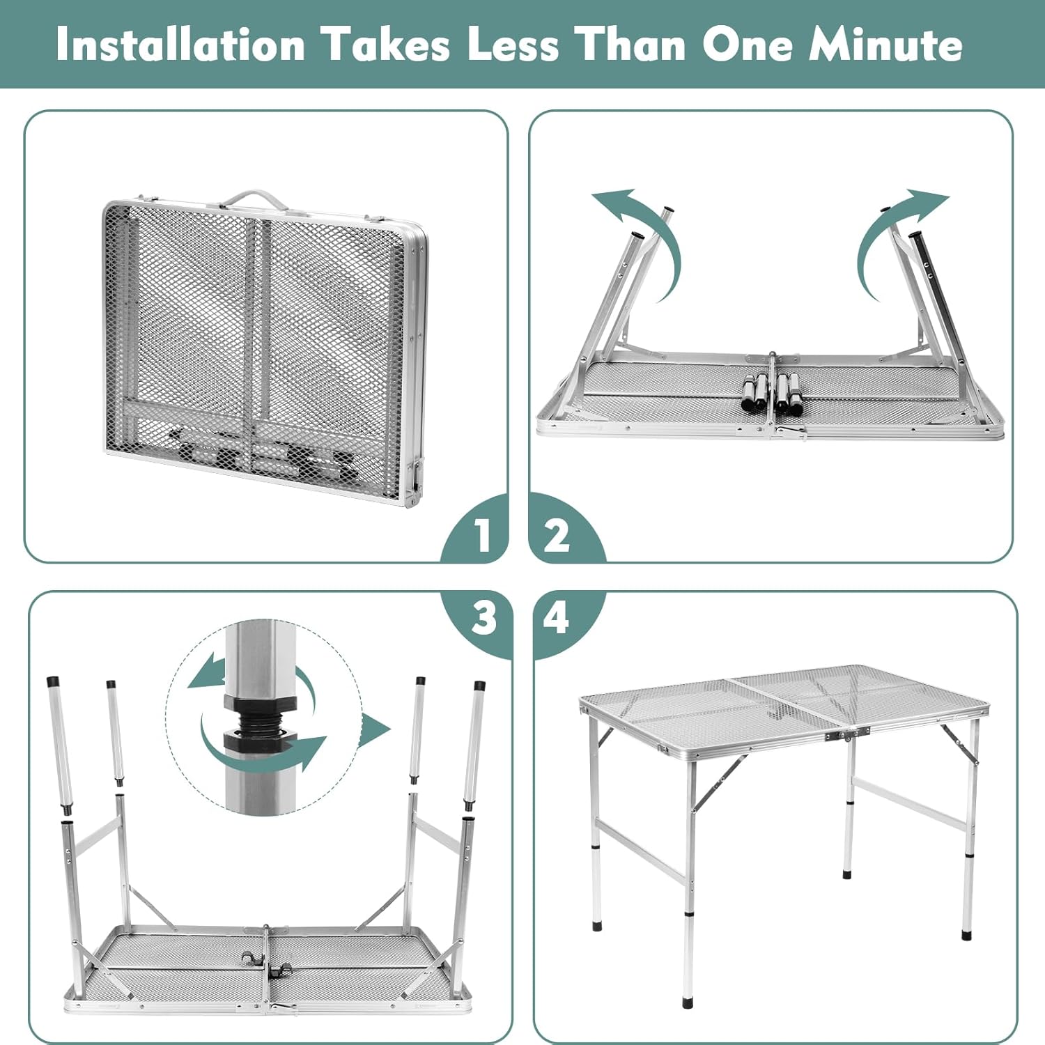 - [Robust and Sturdy] The folding table is made of high-quality aluminum alloy, ensuring its sturdiness and durability. The table top is designed with a metal mesh surface and has been treated with a thickened paint coating, allowing it to withstand prolonged exposure to high temperatures. When stored in the garden, it is resistant to rain and snow, as the limited contact area with the table surface minimizes the risk of staining and rusting