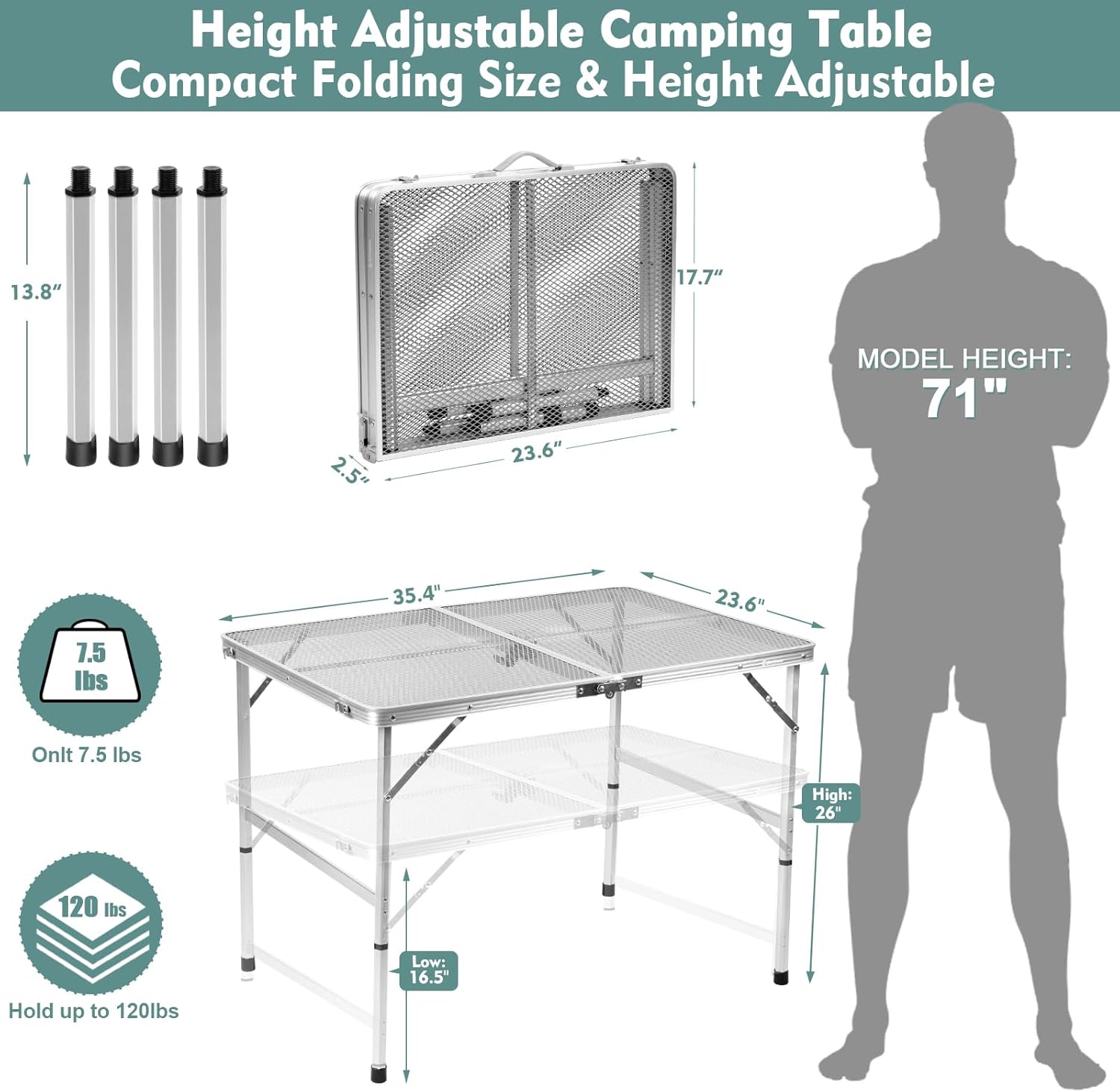- [Lightweight and Portable] Folded, the package measures 23.6Γ17.7Γ2.56 inches, and the weight only 3.4 kg/7.5 lbs,easily fitting into your car or RV. It can be used as a camping table, bbq table, patio table, picnic table, side table, outdoor activities, campfire, card table, etc