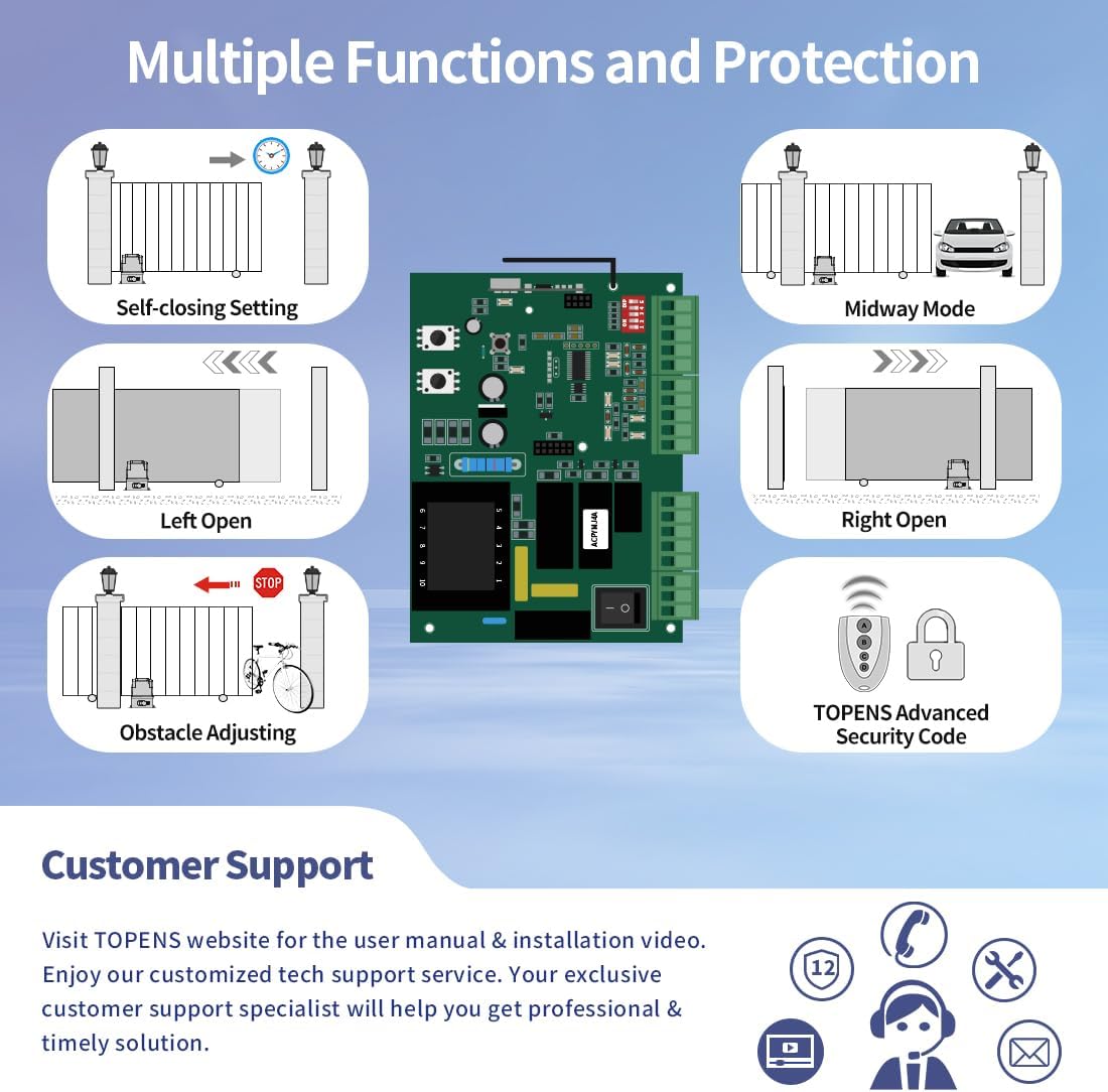 - 【Outstanding Customer Support】 TOPENS provides our customers with the 30-day exchange & return, 12-month war-ranty and excellent tech support. Visit TOPENS website to download the user manual, watch the installation video and enjoy our customized service. We know that each gate is different, so if you have any questions, get in touch with us. TOPENS specialists will help you get professional and timely solution.