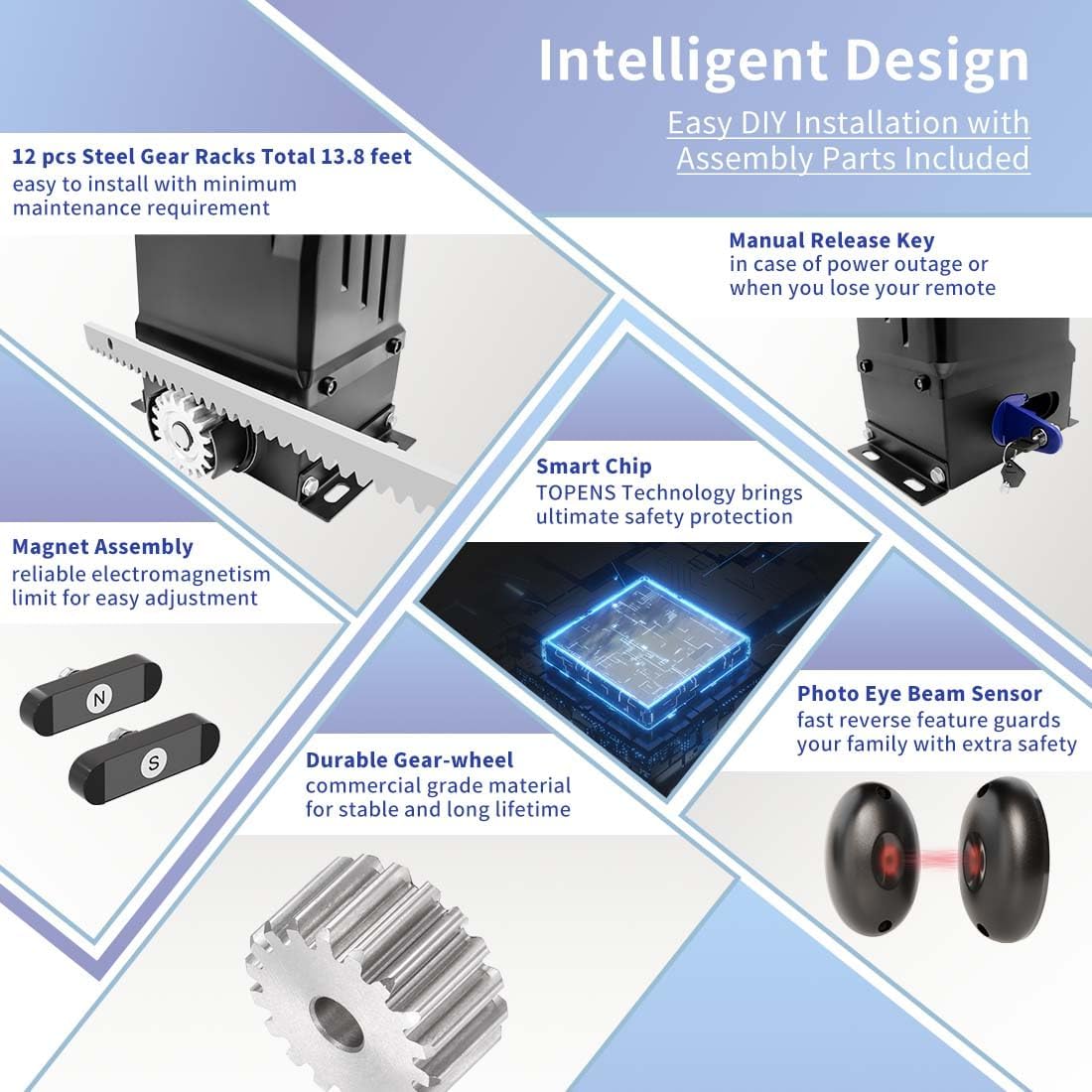 - 【Choose TOPENS】 Over 25 years of specialized experience in gate automation industry. We aim to deliver safe, smart & reliable gate operator systems with long-lasting performance. Equipped with a STRONG 1-1/4 HP 1000W AC motor, RK2500T sliding gate opener smoothly drives the heavy-duty slide gate up to max 5700 lbs. in weight and 40 ft. in length. This ultra-quiet electric gate motor will automatically open and close your gate, and bring your family an easier and more comfortable life.
