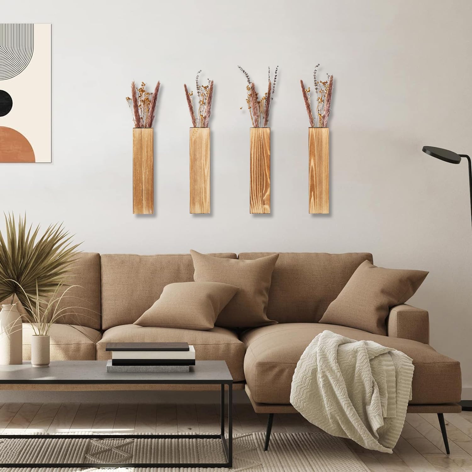 Wooden Wall Planter Set of 4 - Modern Home Decor for Living Room, Bedroom, Bathroom - Brown Finish Planter for Dried Flowers, Faux Greenery, Indoor Plants